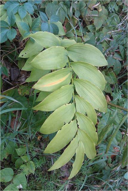 One major difference between Polygonatum and Smilacina is in the root rhizome. The true Solomon’s Seal has the mark of King Solomon found whereever the stems have detached from the rhizome–the rhizome is fairly think, mealy, and light colored within. The False Solomon’s Seal bears a rhizone that is dark brown, thin, and when you try to cut it open, very fibery. There are no leaf scars on the surface, much less scars with vascular marks resembling any sort of sealed wax instrument. But also, the leaves (actually leaflets) of Polygonatum are perfectly paired along the stem, and the plant produces well defined flowers in pairs alongside the leaflet pairs. Smilacina has its leaflets alternating, with flowers usually near the tip. From this observation alone we can tell whether or not the “Convallaria” is a true or false soloman’s seal.