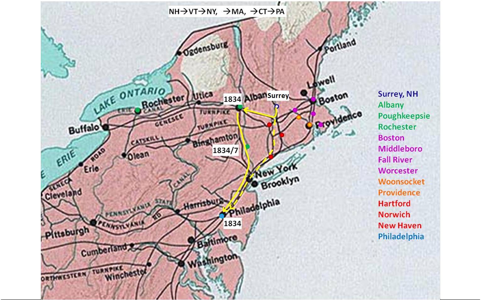 A review of the routes between these urban settings provides us with some additional insights into the popularization and spread of Thomsonianism once the printing press became the way to distribute this information. Aside from the general diffusion of Thomsonian that had taken place in the New York-Connecticut-Vermont-New Hampshire region for a little more than ten years, the primary commercial routes for the news related to the journals tended to take the major transportation routes from Surrey (Thomson’s home setting) to Albany, and from there south toward Philadelphia. Along the way, Poughkeepsie became the main stopping point for this route, more than likely instead of New York City. This was probably due to the unwelcome nature the medical profession had regarding Thomsonianism about this time. During the 1830s, the major medical school in New York was active in the City, along with its related professional journal. As a result, Thomsonians bypassed the New York City route for the most part in their attempts to spread the Thomsonian influence, and make their way to Philadelphia where for some reason a much stronger following could be established.