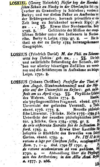 A number of other references published at the time refer to Loskiel in a brief biography, or mention his book as a new acquisition. Several examples of these follow: