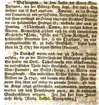 In Die Vereinten Staaten von Nord-amerika by Christophe Daniel Ebeling (Hamburg, 1794,), on p. 974 he mentions “Tschekomeko oder Shekomeko, im nordostlichen Theile dieser Grafschaft, oder dem Little Nines Partners, am Stissik: Berge, 5 ge. Meilen von Pouqhkeepsie.” This reference to Loskiel by Ebeling continues to reappear in the following: D. Anton Friderich Büschings Erdbeschreibung Dreizehnter Theil, welcher Amerika begreift. Die vereinten Staaten von Nordamerika (Hamburg, 1794, p. 1016 footnote makes reference to Loskiel); Christoph Daniel Ebeling, Anton Friedrich Büsching, in Erdbeschreibung und Geschichte von Amerika: die vereinten Staaten von Nordamerika …, Volume 4, (Hamburg, 1797), pp. 67, 720, 829.