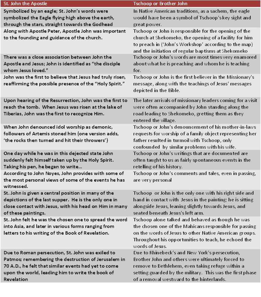 To continue on the theme produced in the prior sections on baptisms and names, three saints are once again reviewed. First there is Saint John the Baptist, someone whose life is very much that of the natural theologian and natural philosopher, like the lives engaged in by many American Indian during the Moravian Mahican missionary period. In he beginning we are uncertain as to whether or not the “John” which Tschoop received as his baptsmal name refers to John the Baptist, a minister who provides his service in the the wilderness, or some other John. Second, there is a review of the Book of Job, the name which sounds like the way “Tschoop” was actually pronounced by the Dutch. More than likely the name Job was associated with Tschoop due to the resemblances of this name to some name used by locals for Tschoop, before the spelling ‘Tschoop’ became the standard used by story tellers and history writers. Although Job himself isn’t exactly a saint, he is an individual who missionaries could very well have used as Tschoop’s baptism name, were it not for the fact that one other individual, who is a Saint, compares better with Tschoop’s life experiences than Job. The individual Tschoop relates most to in the Bible is that John who is so important to Bible history that he is known as St. John the Apostle. It was the decision of the missionaries to recognize and encourage the fact that Tschoop’s or John’s life and enthusiasm as a preacher was best equated with that of an Apostle, one of the first of the few to follow the new teachings of Jesus during its earliest days, months and years. Jesus’ closest companion during the last supper, the one seated most closely to Jesus and who was there when he was most needed, that is the John that the Moravian missionaries were comparing this sachem to.