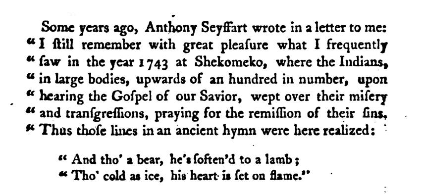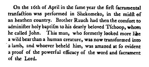 “His [Rauch’s] heart burned within him, whilst he testified to this poor heathen of the power of the blood of Jesus. Soon after this, Shabasch was also awakened, and the labor of the Holy Spirit became remarkably evident in the hearts of these two savages. Their eyes overflowed with tears, whenever Brother Rauch described to them the sufferings and death of our Redeemer.”