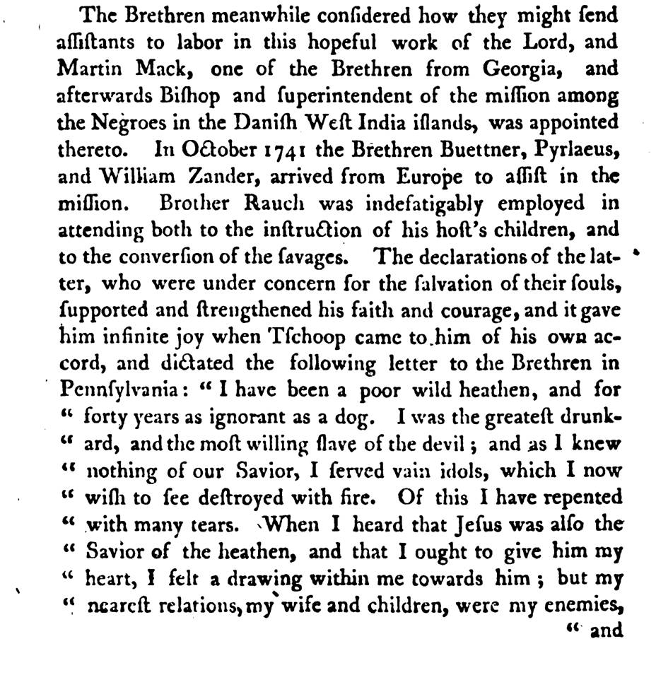 “Having thus regained the confidence of the Indians, brother Rauch was unremitting in his labour for their good, and had the joy to observe, that many were powerfully impressed when discoursing to them of the love of Jesus to sinners. But, in no instance did the word reach the conscience with greater power, or more strikingly display its saving efficacy, than in the case of Tschoop, before his conversion he was distinguished by every act of outrage and sin, and had even crippled himself by his debaucheries; but now the lion was tamed, and the slave of sin and the devil became a child of God and a preacher of righteousness to his countrymen.