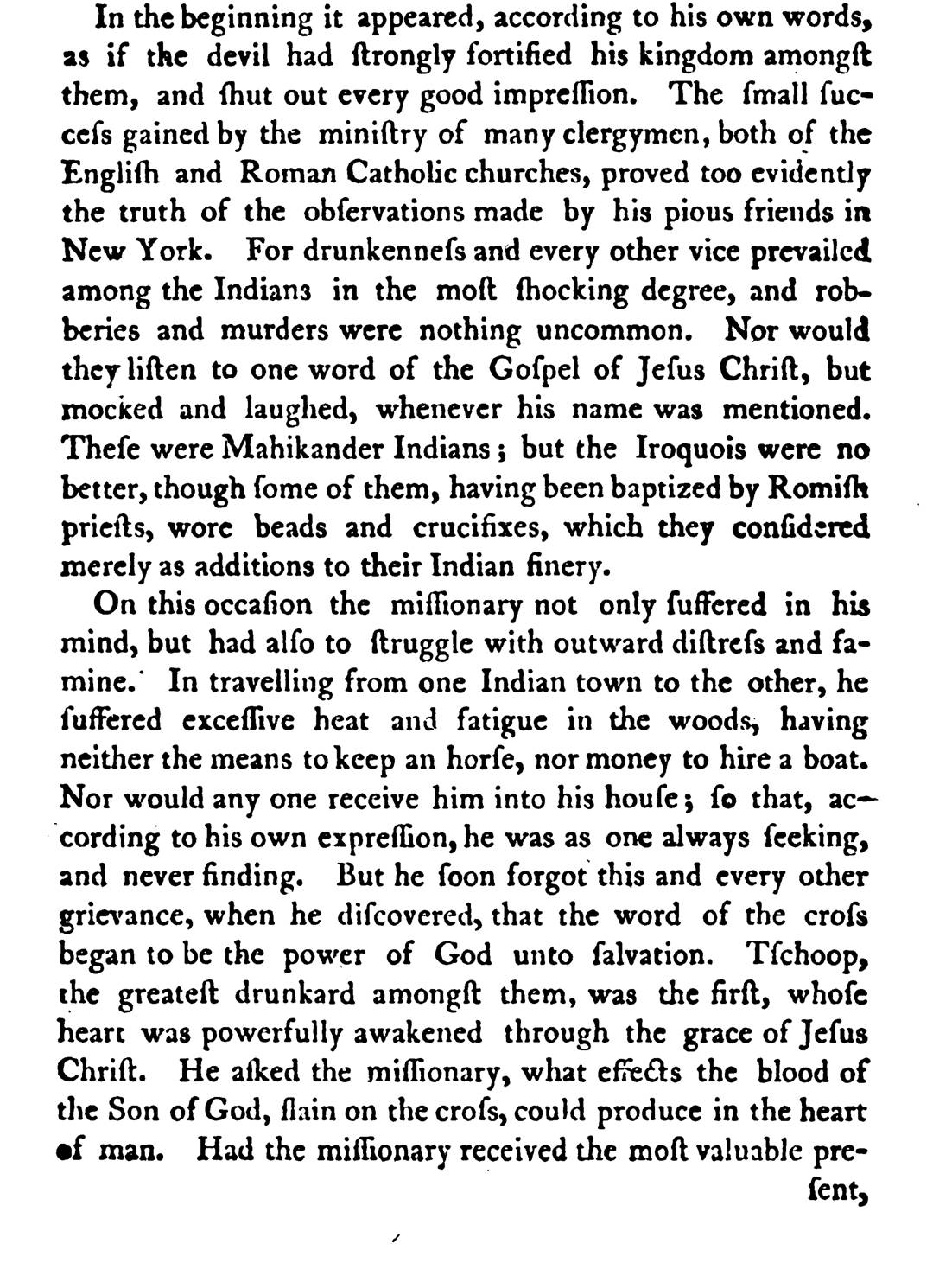 Both Tschoop and Shabash, who were among the greatest drunkards, were awakened. Their eyes overflowed with tears, when the sufferings and death of the Redeemer were described to them. Some Christians in the neighbourhood hearing of this, invited the missionary to preach in a barn, which he did for a year with success. But these exertions roused the malice of such among the white inhabitants as were unwilling that the heathen should be instructed ; and they contrived to prejudice the Indians against the missionary, by reporting that he was only seeking to deprive them of their liberty. The savages, irritated by these reports, threatened to shoot him if he did not leave the place. He took shelter with a farmer in the neighbourhood, but continued his visits and instructions. At length even Tschoop and Shabash became so much incensed, that the former attempted to shoot him, and the latter constantly avoided his presence. He followed them with patience and love, sowing the word with tears ; and though some of the Indians talked of hanging him up in the woods, and one actually ran after him with a hatchet, and would have killed him hut for stumbling into the water; all began to admire his courage, united with so much meekness and humility. He often spent half a day in their huts, ate and drank with them in a friendly manner, and even lay down to sleep in the midst of them, with the utmost composure. This last circumstance made a deep impression on the minds of the Indians, particularly on that of Tschoop, who one day, while the missionary was lying fast asleep before him, was struck with the thought, ” This cannot be a bad man. He fears no evil, not even from us who are so savage. Here he sleeps comfortably and places his life in our hands.” On farther reflection he was convinced that the reports of the white men were malicious, and he attempted, with success, to remove the unfavourable impressions of his countrymen.*