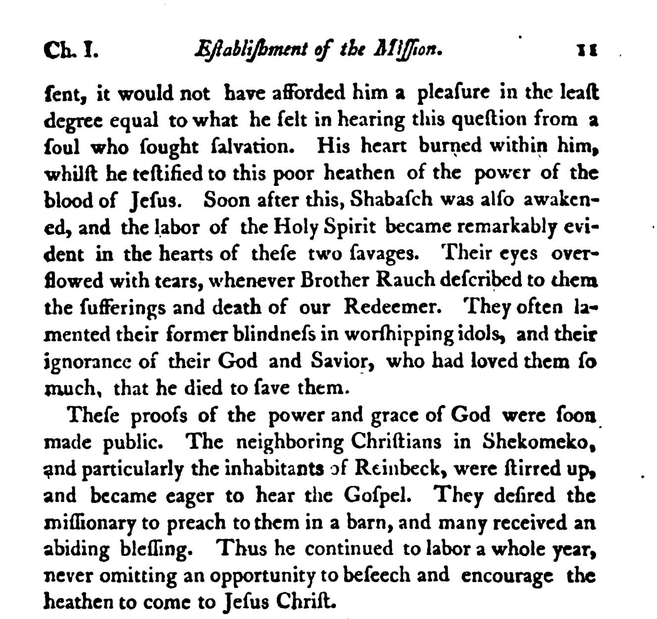 “When he had finished his discourse, he lay down, fatigued with his journey, and fell into a sound sleep. I thought: What kind of man is this ? There he lies and sleeps; I might kill him and throw him into the wood, and who would regard it ? But this gives him no concern. However, I could not forget his words. They constantly recurred to my mind. Even when asleep I dreamt of the blood Christ shed for us. I found this to be widely different from any thing I had heard before; and I interpreted Rauch’s words to the other Indians. Thus, through the grace of God, an awakening commenced among us. 1 say, therefore, brethren, preach Christ our Saviour and his sufferings and death, if you would wish your words to gain entrance among the heathen.”