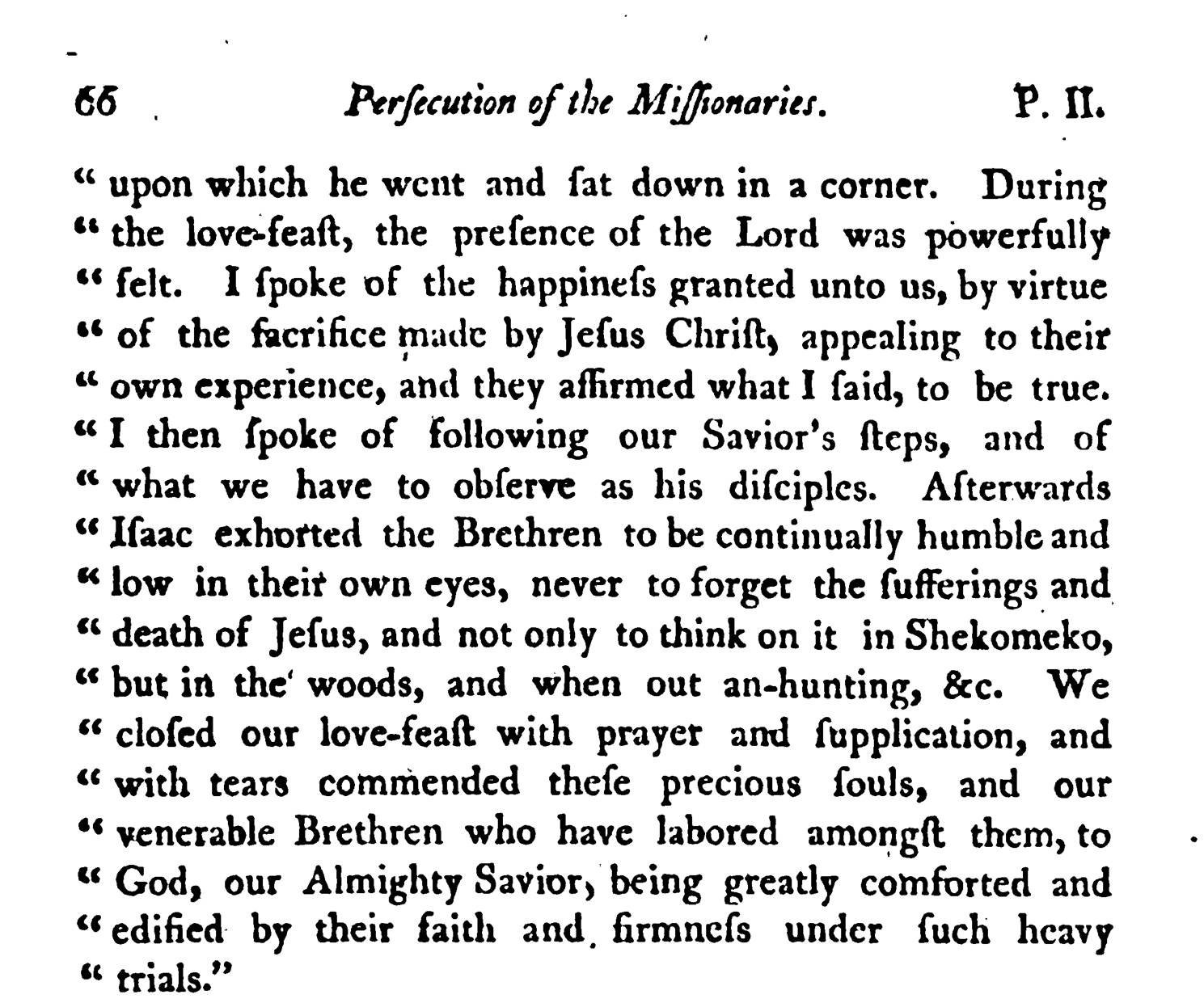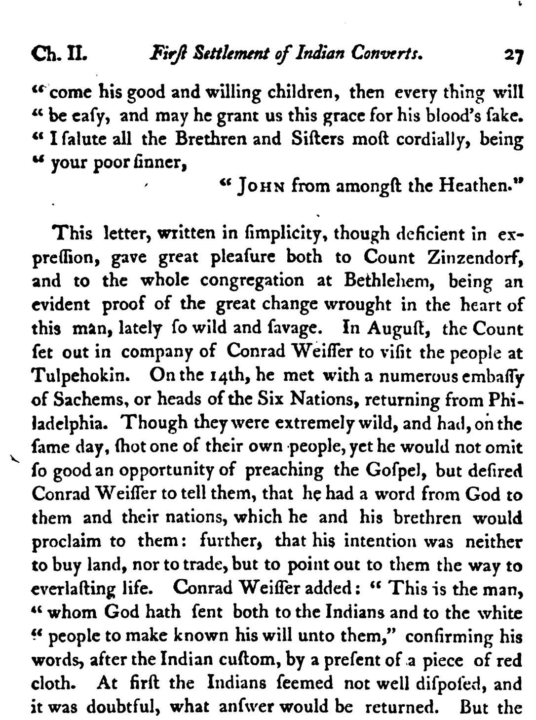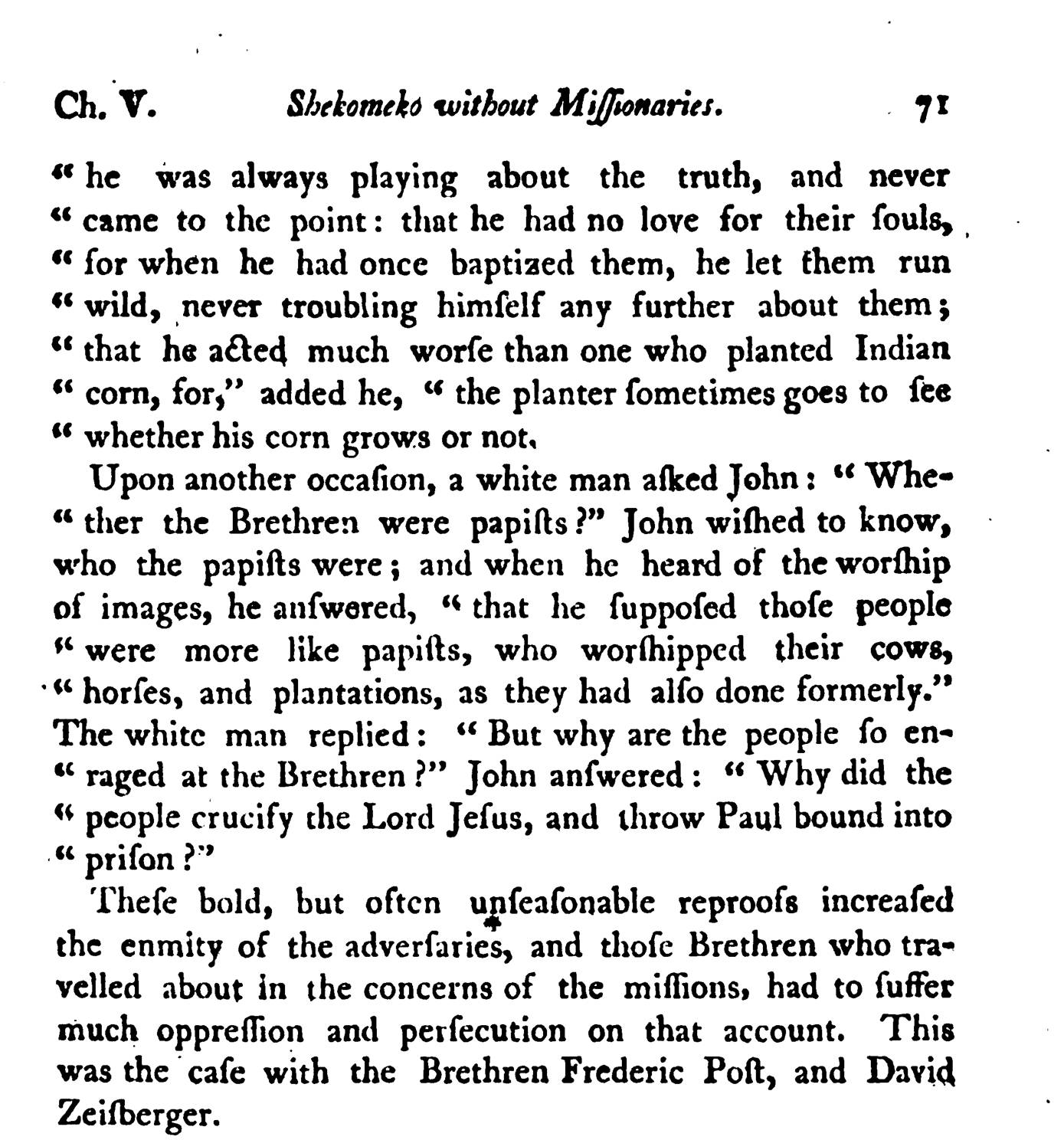 Excerpt from History of the Mission of the United Brethren among the Indians in North America, by George Henry Loskiel, Part II. p. 7. In Miron Winslow. A sketch of missions: or, history of the principal attempts to propagate Christianity among the Heathen. Chap. 8, “North America”, 192-216. 1819.