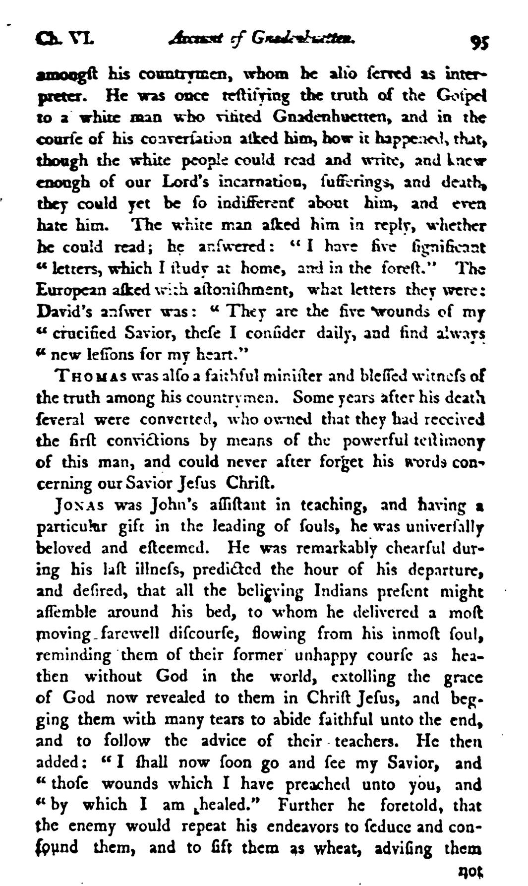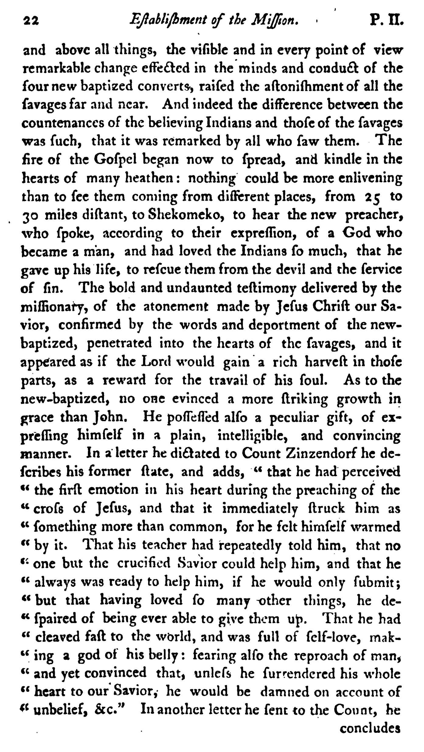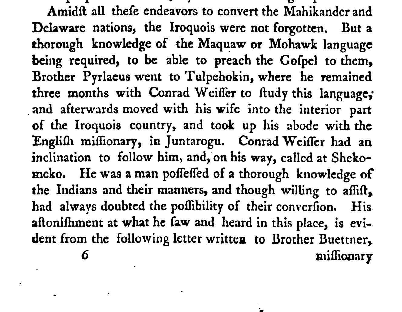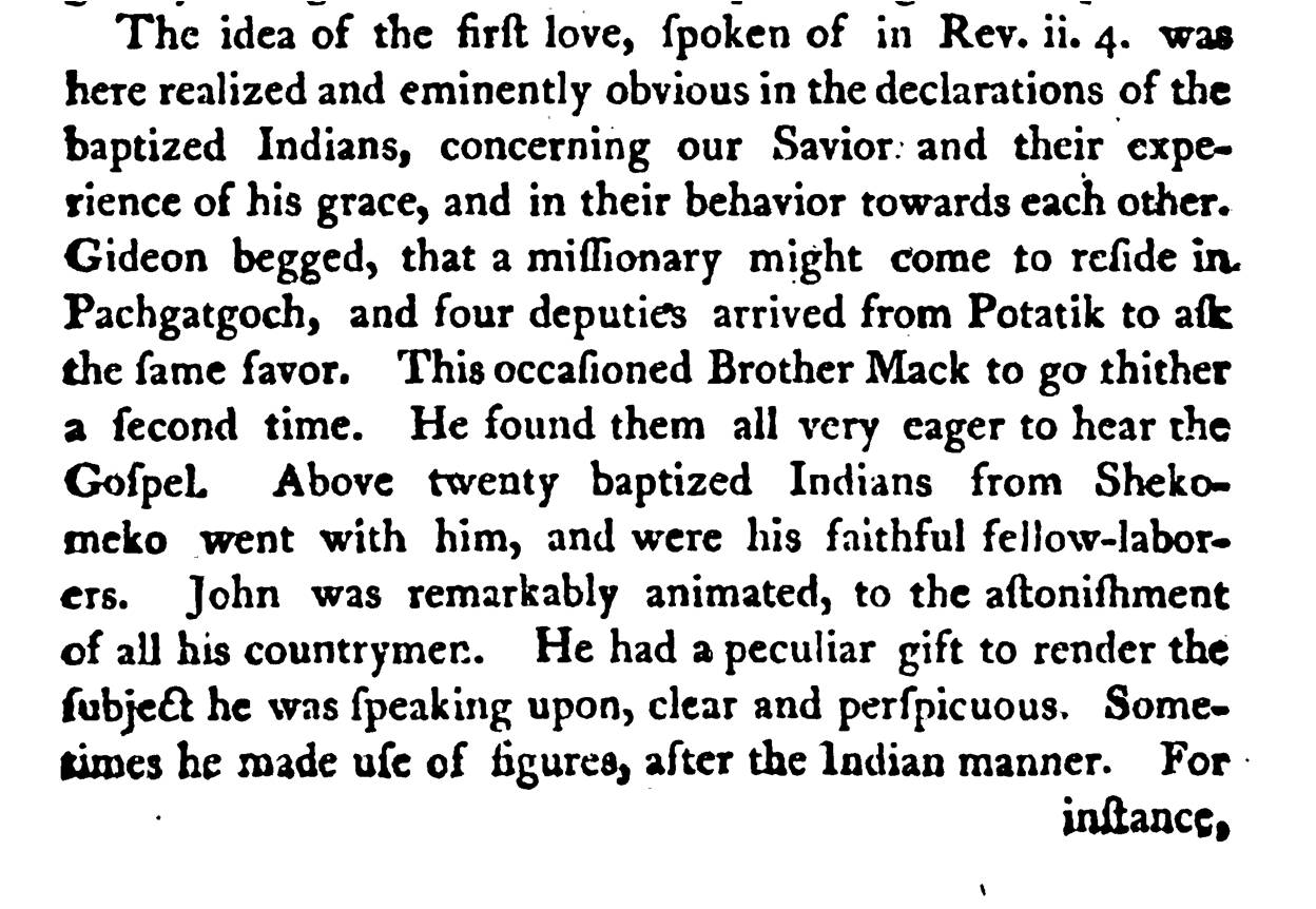 Excerpt from History of the Mission of the United Brethren among the Indians in North America, by George Henry Loskiel, Part II. p. 7. In Miron Winslow. A sketch of missions: or, history of the principal attempts to propagate Christianity among the Heathen. Chap. 8, “North America”, 192-216. 1819.