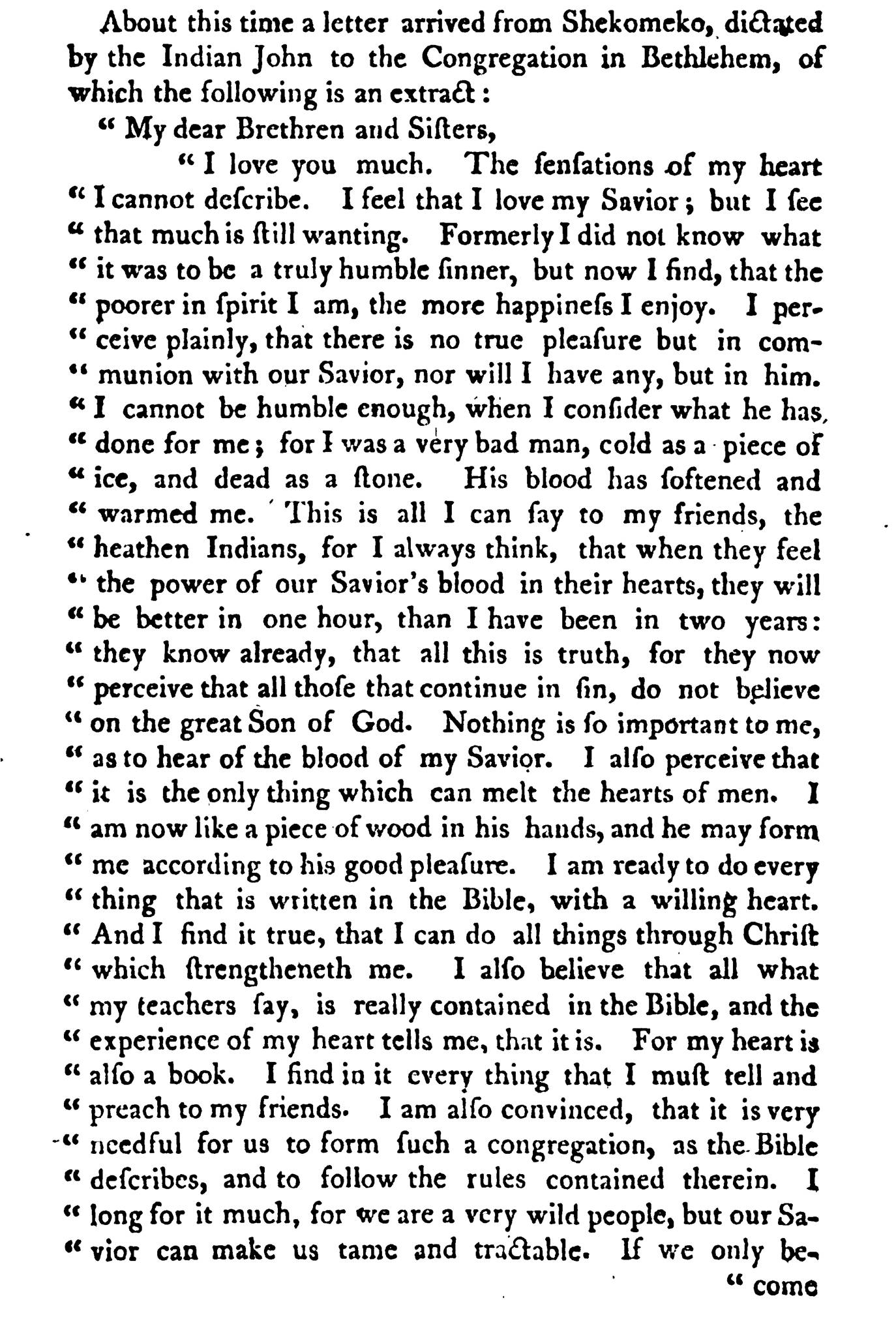 ” This is all I can say to my friends, the heathen Indians, for I always think that when they feel the power of our Saviour’s blood in their hearts, they will be better in one hour than I have been in two years. They know already that this is truth, for they now perceive that all those that continue in sin, do not believe on the great Son of God. I also perceive that it is the only thing that can melt the hearts of men. I am now like a piece of wood in His hands, and He may form me according to His good pleasure. I am ready to do everything that is written in the Bible, with a willing heart; and I find it true that I can do all things through Christ, which strengtheneth me. I also believe that all what my teachers say is really contained in the Bible, and the experience of my heart tells me that it is; for my heart is also a book; I find in it everything that I must tell and preach to my friends. I am also convinced that it is very needful for us to form such a congregation as the Bible describes, and to follow the rules contained therein. I long for it much, for we are a very wild people, but our Saviour can make us tame and tractable. If we only become His good and willing children, then everything will be easy; and may He grant us this grace for His blood’s sake.