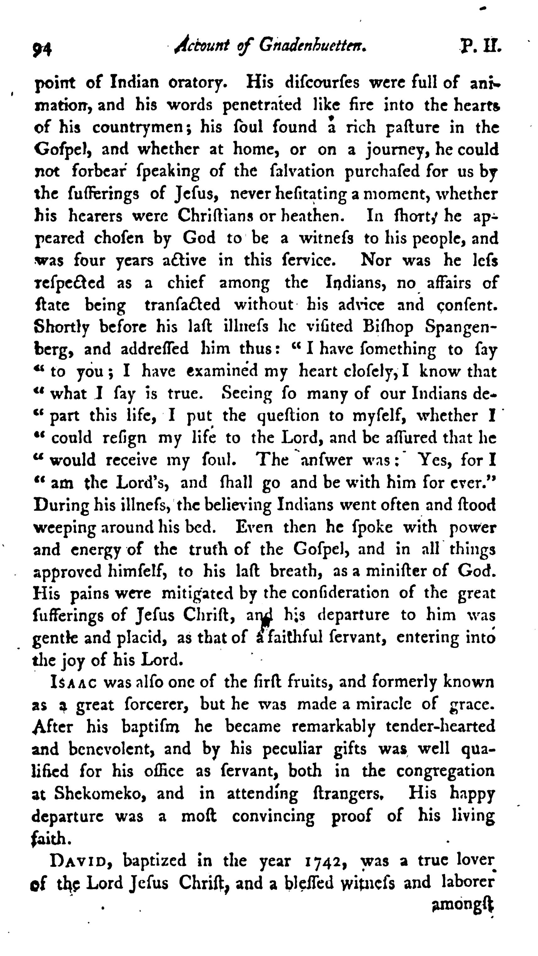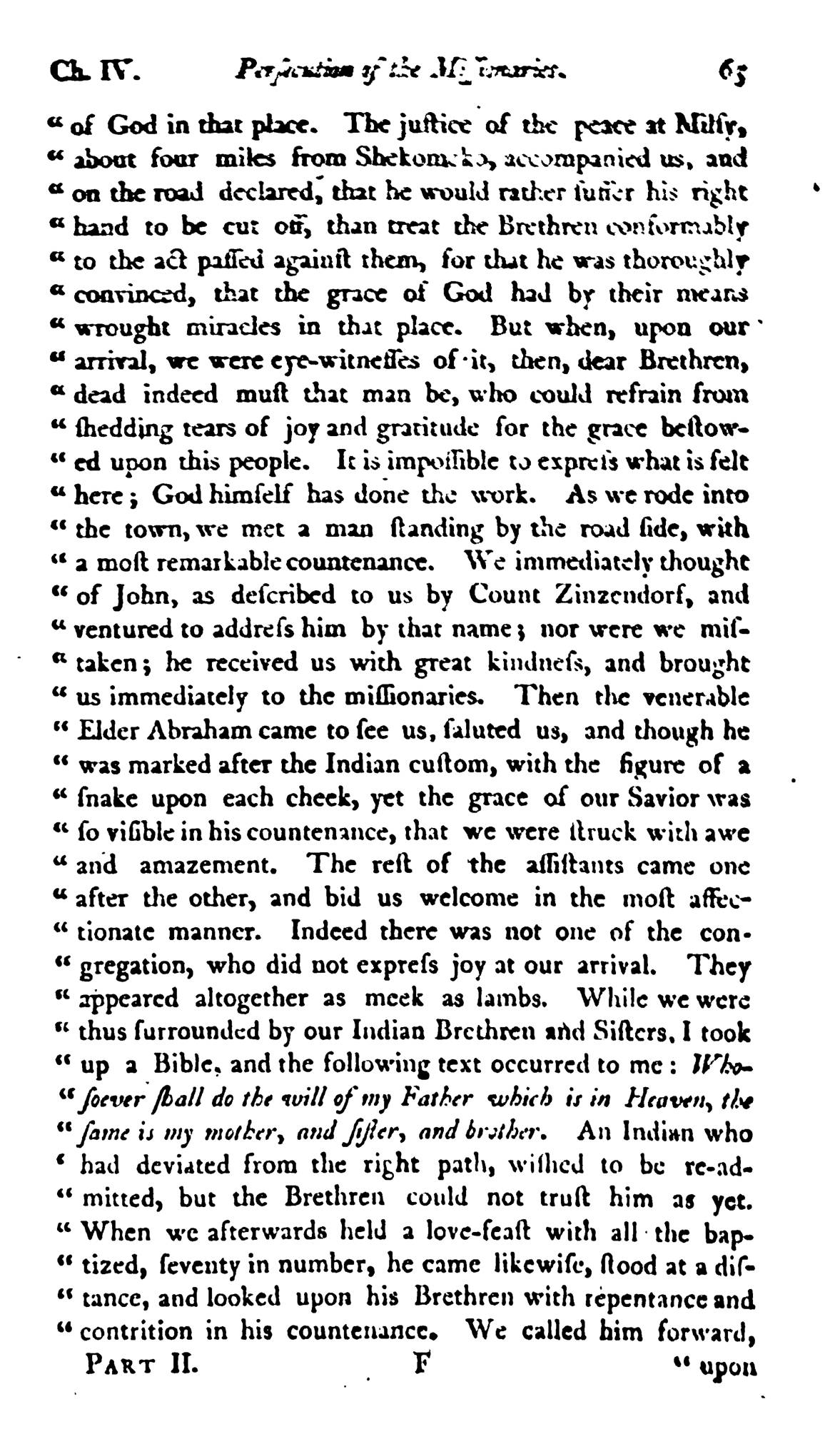 “The account he once gave of his conversion, will best elucidate the striking change wrought in him. “Brethren,” said he, “I have been a heathen, and have grown old amongst them; therefore I know how heathen think. Once a preacher came and began to explain to us, that there was a God. We answered, ‘ Dost thou think us so ignorant as not to know that? Return to the place from whence thou earnest.’ Then again another preacher came and said : ‘ You must not steal, nor lie, nor get drunk, &c.’ We answered: ‘Thou fool, dost thou think us ignorant of this ? Learn first thyself, and then teach the people, to whom thou belongest, to leave off these things. For who steal, lie, or are more drunken than thine own people?’ And thus we dismissed him. After some time brother Rauch came into my hut, sat down and spoke nearly as follows : ‘ I am come to you in the name of the Lord of heaven and of earth: He sends to let you know, that he will make you happy, and deliver you from the misery, in which you lie at present. For this end, he became a man, gave his life a ransom and shed his blood for sinners, &c.