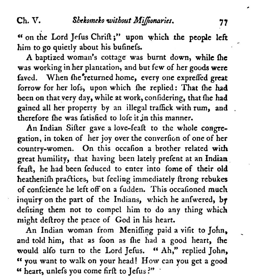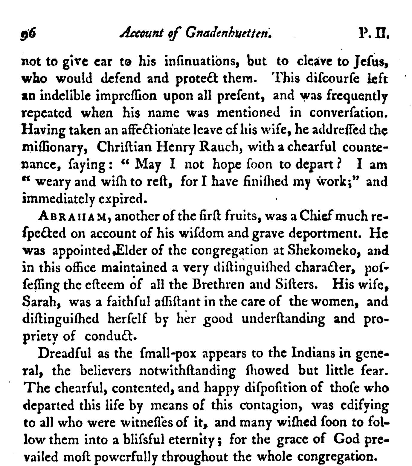 “Having now regained the friendship of the Indians, Rauch had soon the pleasure of witnessing the fruit of his labours among them. Several of them were much impressed with the love of Christ to sinners, as displayed in his sufferings and death. The change which took place, on Tschoop in particular, was remarkably striking. Formerly he was the greatest drunkard in the whole town, and had rendered himself a cripple by his debaucheries. Now the drunkard bad learned to be sober, and the man who was savage as a bear had become gentle as a lamb.”