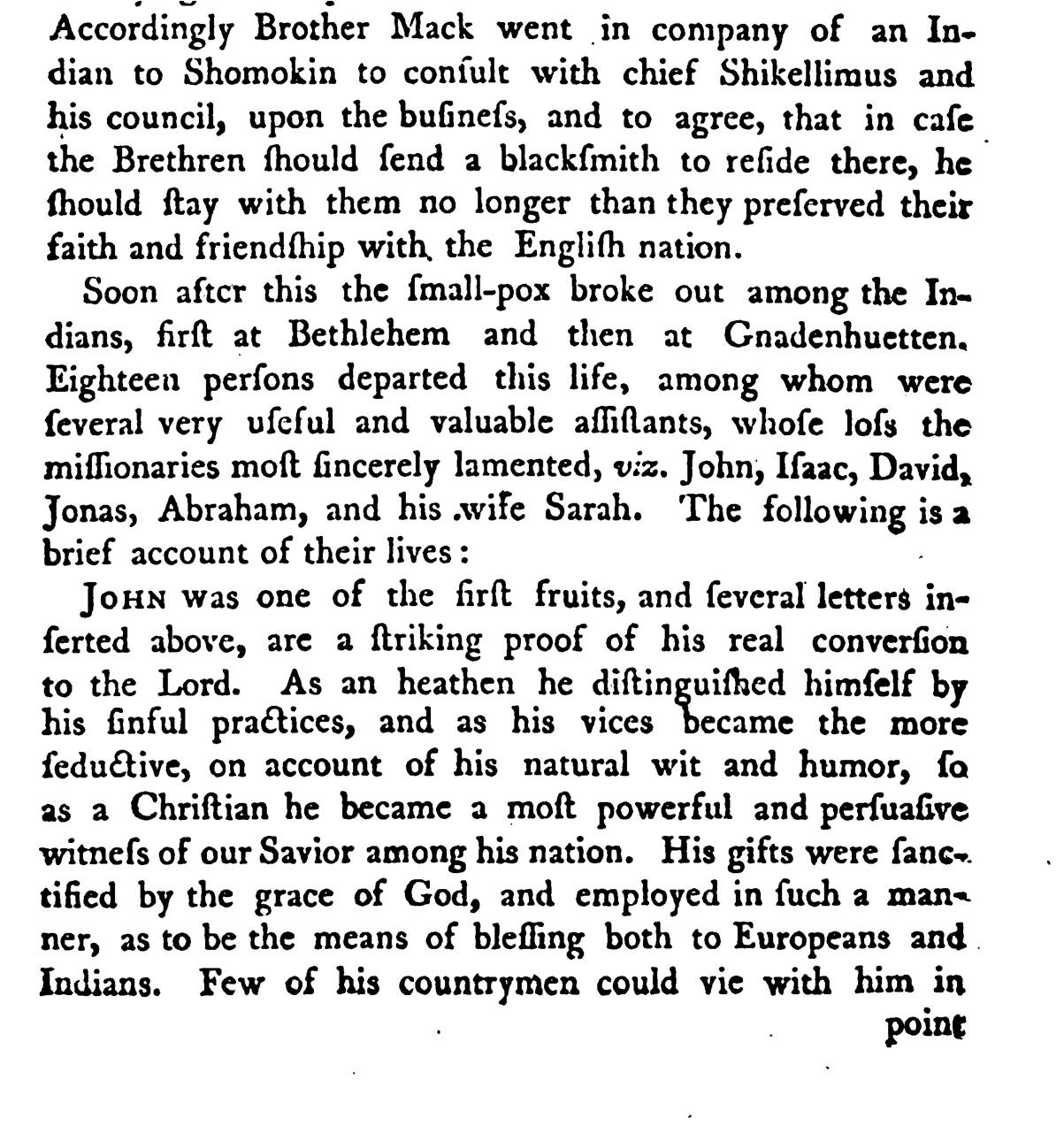 “One day a gentleman, passing through Shekomeko, called on the Count, and entered into a dispute with him concerning the person of the Son of God. The Indian, John, who was lying on the floor, ill, began to pray that Jesus Christ would reveal Himself to the gentleman, and when he was gone, John exclaimed, ” Oh, how will this man be ashamed, when he learns to know the Lord Jesus.” During the Count’s visit to this place, six more individuals were baptized, and thus the first congregation of believing Indians, established by the brethren in North America, consisted of ten persons. Their sincerity, faith, and love afforded inexpressible joy to the brethren; and they were treated with esteem, in a remarkable manner, even by the wildest savages.