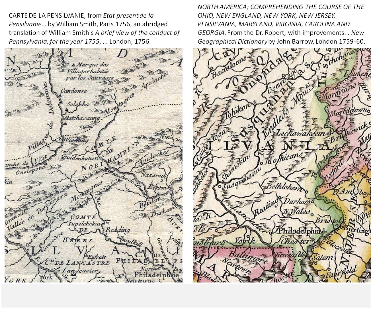 Notice the differences in nomenclature used on these two maps which depict pretty much the same history. The recognition of “Gnaddenhuten” (adjacent to COMTE DE NORTHAMPTON” versus just “Mohicans” in the right image, above Bethlehem. Is this a political statement?