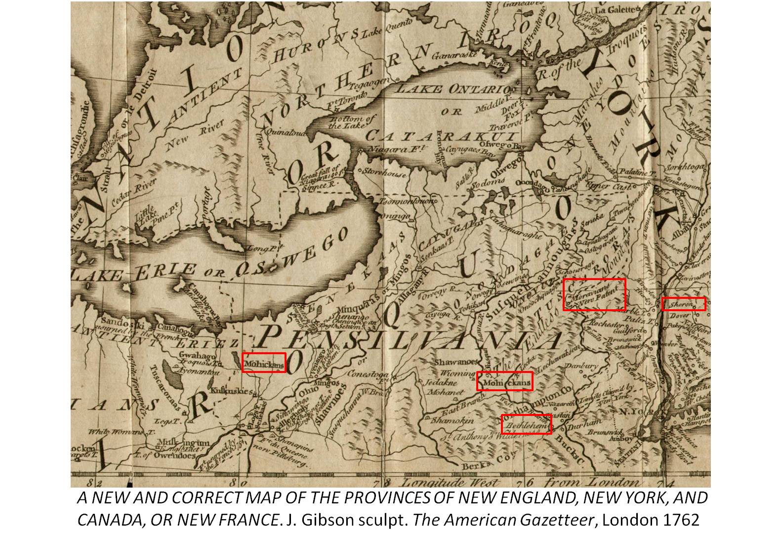 First, the Mahicans weren’t the only Native American tribes forced to make these westward migrations. If we take a close look at some of the Atlas maps published during this time, we find the Moravian-Mahican hamlets planted right upon territories once inhabited mostly by other tribes, and we also find other former more eastern tribes also trying to make claim to these virginal or non-colonized territories such as the Cherokee and Iroquois.