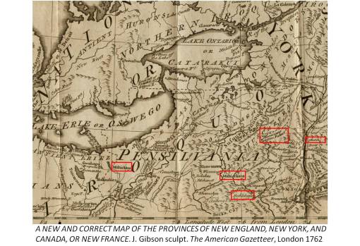 When we look at early colonial interpretations of the New York-Pennsylvania area, in which the far western parts of Pennsylvania and what would become Ohio are included, we find mention of the Moravians. When we look at British versions of these maps of the beginning of Western Territory, we find no reference to the Moravian aspect of this Native American group, they are only referred to as Mohicans. By the 1770s, the Moravian aspect of Mahican/Mohican history has been dropped from the educational and reading materials. We are only left with evidence for small collections of what were formerly sizable national tribal systems. These were now disappearing from the newest versions of these colonial maps, with the British maps documenting this more than the French maps.
