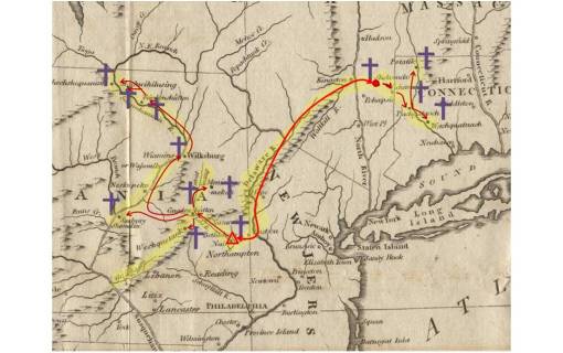 From the maps, we also learn more about the spread of the Word. We hear mostly about Shekomeko and Tschoop’s experiences with the nearby village set up just west of Sharon near Indian Lake. At times we are also told about the missionary activities engaged in down near Kent, Connecticut. The maps alone tell us that there were two other places not normally discussed much in any later writings,one just north of Sharon along a creek, and the other much further into Connecticut to the south and east of Kent, a location close to the edge of colonial civilization.