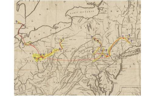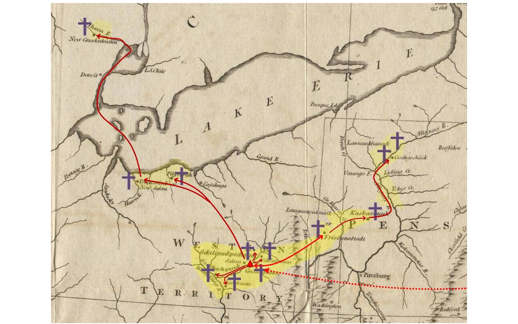 The boundaries of the Moravian Missions are thus portrayed as far as can be physically reached on foot, horseback or canoe/boat from Shekomeko westward into the hinterlands, but only as far as the borderlands of the rapidly growing European settlements and townships located to the south, north, and east of Shekomeko.