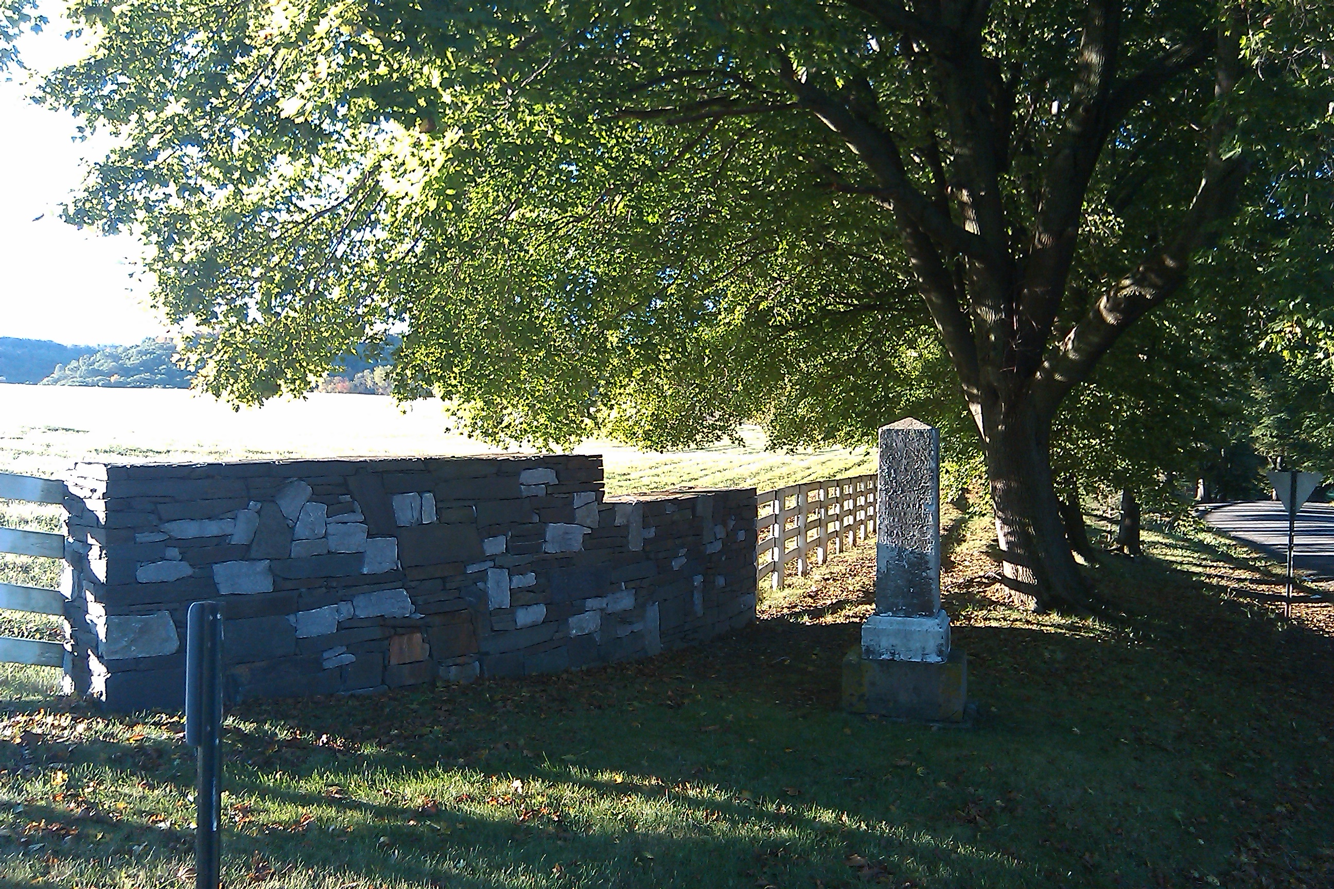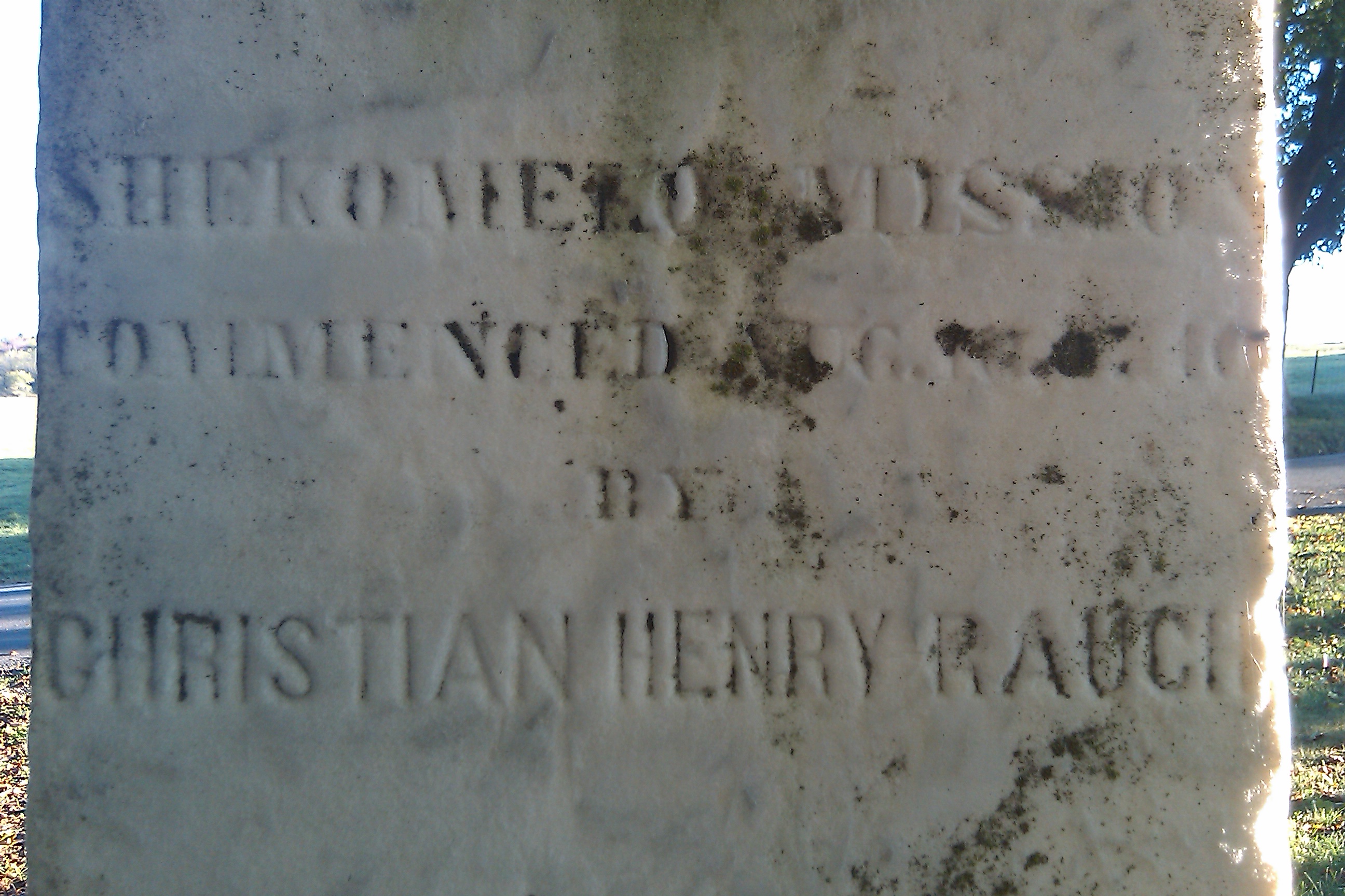 One final topic was uncovered in my review of Mahican Christian Indian history. This was uncovered during my review of the paintings of the Moravian missions success produced in Philadelphia around 1747. In a book published about the Moravian Christian Indians at Shekomeko during the early 1900s–DeCost Smith’s Martyrs of the Oblong and Little Nine (Caldwell, Idaho, 1947), as well as many of the writings about the dedication of Shekomeko as a local landmark and historical site, Moravian mission agent Gottlob Buettnor is referred to as a “martyr” for this cause due to his short life with the missions. In 1859, an important historical event took place in which a monument was raised describing this importance of the missions in local Shekomeko and Pine Plains history.