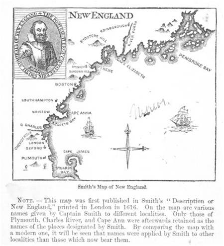 The next map of New England was originally published as part of Smith’s Description of New England in 1616. Important to note is the westward most extent of this depiction of the prior British land claim of this territory made by Sir Walter Raleigh. A significant portion of it appears in the above satellite image.
