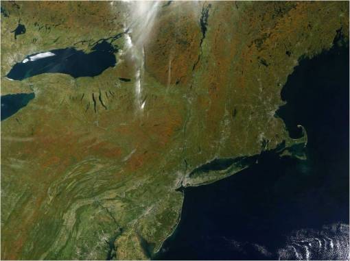 The following satellite image depicts parts of New England, New France, New Netherlands/New Belgium, Virginia/New Britain, and parts of New Scotland, and New Sweden. By a simple review of this image can you tell where the boudaries of these territories lie? How do you describe these edges or boundaires based on this view taken from above? Which topographic features are also most likely visible at ground level, and so used to define these political boundaries in the original colonial land claims?