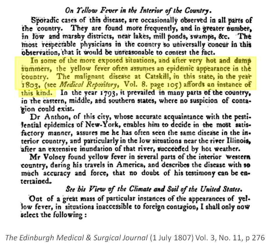 The more heavily populated regions north of New York along this North River were the first to witness cases and people on board infected ships taking their first steps in upstate New York settings. For the most part these epidemics were not at all comparable to the serious epidemics striking the big cities down below. But these local cases were enough to confirm some of the findings and suspicions out there about yellow fever and its potential causes. This article is one such example of this study of Yellow Fever epidemiology and medical geography.