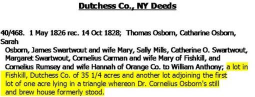 We really have no idea where he had the other buildings typical for the Old Dutch Farm, as this place was originally called in the oldest tax records referring to Osborn’s place. He most likely had a place for one or more horses, and another perhaps for a head of livestock or two or some poultry. He was also likely to have had some gardening area set up where many of his domestic herbs grew such as Hyssop, Sage, and Rhubarb. Still, little to evidence can be found in later documents about this property mentioning the possible existence of some old farm buildings or the like. To determine if such a setting did exist on Osborn’s old estate, one would have to return to this setting and try to determine where additional buildings stood by the homesteading property and then try to find evidence of an old chemical manufactory or brewery setting operating between 1745 and 1780, or later (search for metal pieces, glass pieces, ceramic or earthware chards, and the like). The evidence that such a site exists is seen in the deed for Osborn’s poperty, by then owned by his youngest son James, James’s family, one of James’s in-law relatives, their Remsen (Rumsey) cousins, and two of their friends: