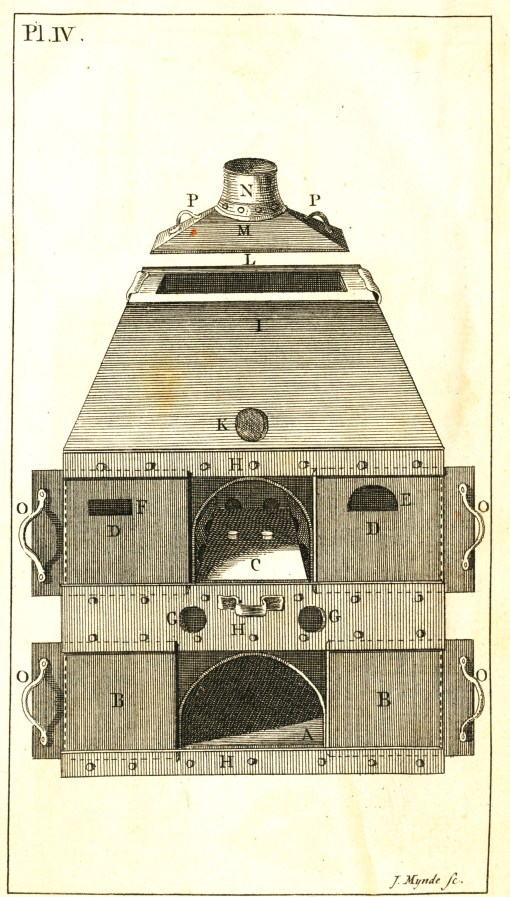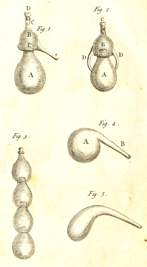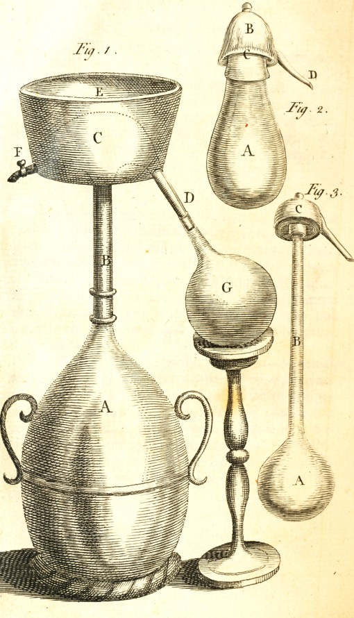 To best understand the layout of such a setting in Osborn’s home, insight into the requirements for such a setting are found here and there in various science books for the time. In 1775, Elements of the Theory and Practice of Chemistry by M. Macquer was translated from French into English and published. This book provides some figures of the typical chemical equipment expected for this time in the history of science. With a little bit of imagination, and a review of his actual living space and work requirements and resources, we can pretty much deduce what Osborn may have done locally to concoct his own remedies, build the unique contraptions needed to ferment and distill his products, and the machinery needed to be a true iatrochemist. The larger pieces of equipment normally required for iatrochemistry may have required that Osborn be more versatile and imaginative with his plans, in order to be able to have the local iron tools-and furnace that he required. Explaining this iron machine to the local iron-specialist/machine-maker on how to produce this item for you and have it fit into you living space would have been quite a task or two for the time. No doubt the smaller glass objects Osborn needed to perform his practice were a great deal easier to have manufactured and probably could have been made by any of a number of glass blowers in the region. This was not an unlikely expectation.