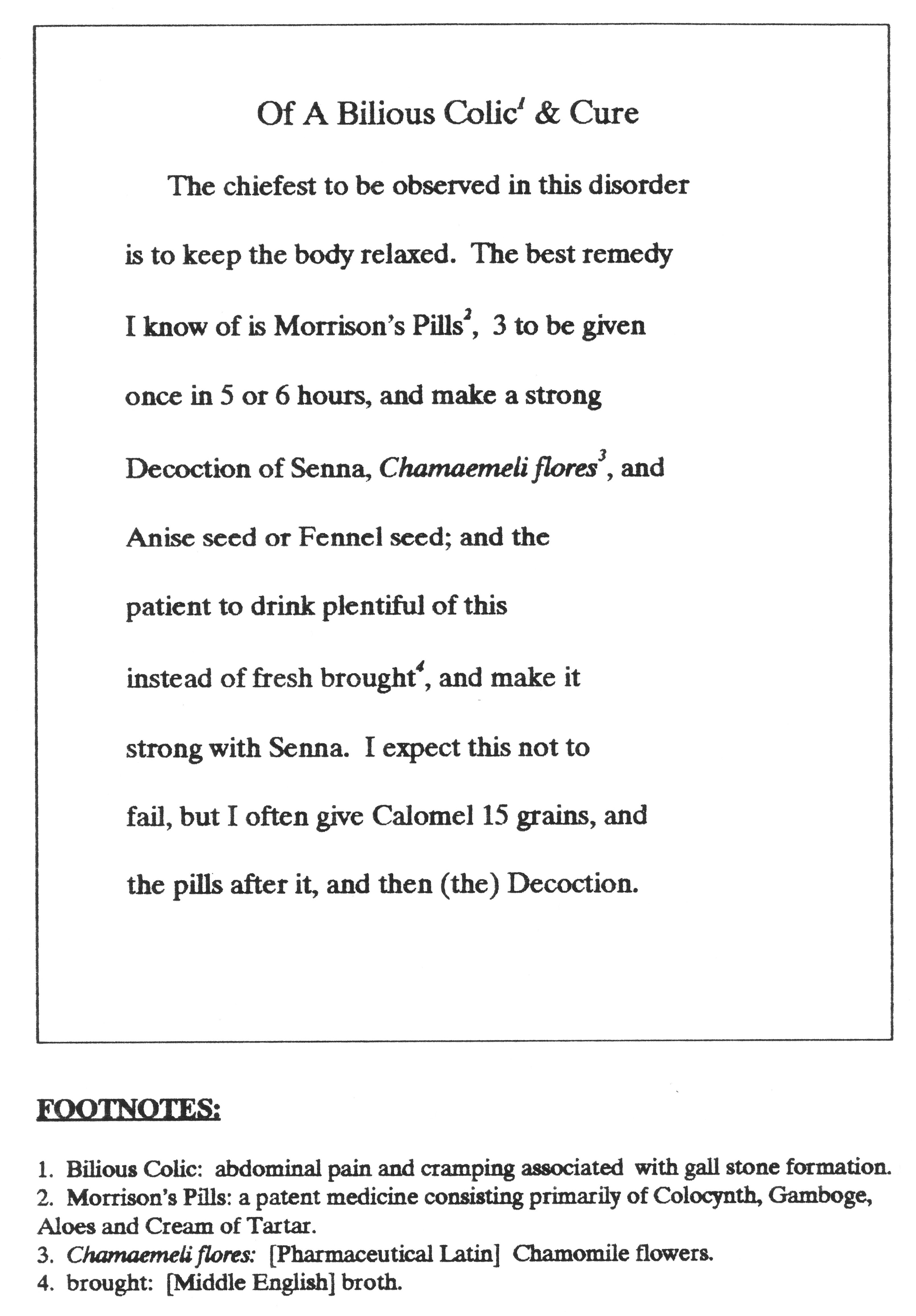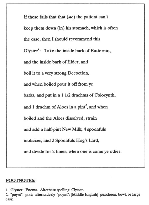 For obvious reasons, Osborn recommends strong laxatives, glysters (enemas), and physics (strong laxatives, often resulting in a water discharge) to treat this condition. The recommendation of vomiting once again correlates with the yellowish appearance vomit can have, implying the reduction in excess yellow bile humours in the body.