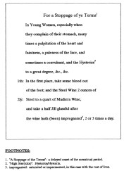 To both the woman and the doctor, a stoppage of the terms could simply be a menstrual period that is late. Many a patient of Osborn’s probably hoped this stoppage was not a sign of some other reason for the delay—the planting of a seed as Austenites might put it. So, in an attempt to clarify why the terms are late, a woman may go to see a physician, or if the opportunity is there a midwife, who usually has better knowledge and therefore better tricks up her sleeve. To the Christian community it is hard to determine just how the strongest of the churchgoers might react to learning that a close friend of theirs went to a lady herbalist, and midwife, to take some tonic for some ailing condition she had. Some would most likely suspect that this could mean the women thinks she is bearing, and would like to stop this new life from coming into the world, in the most proper and delicate of ways. So, the herbalist might prescribe a concoction meant to stimulate the blockage of some inner most energies, causing the most private parts inside to again be vital and capable, all the time knowing probably on both side that this effective purging of the womb was nothing more than an unfashionable means for preventing two people’s carriage. From reaching its destiny .