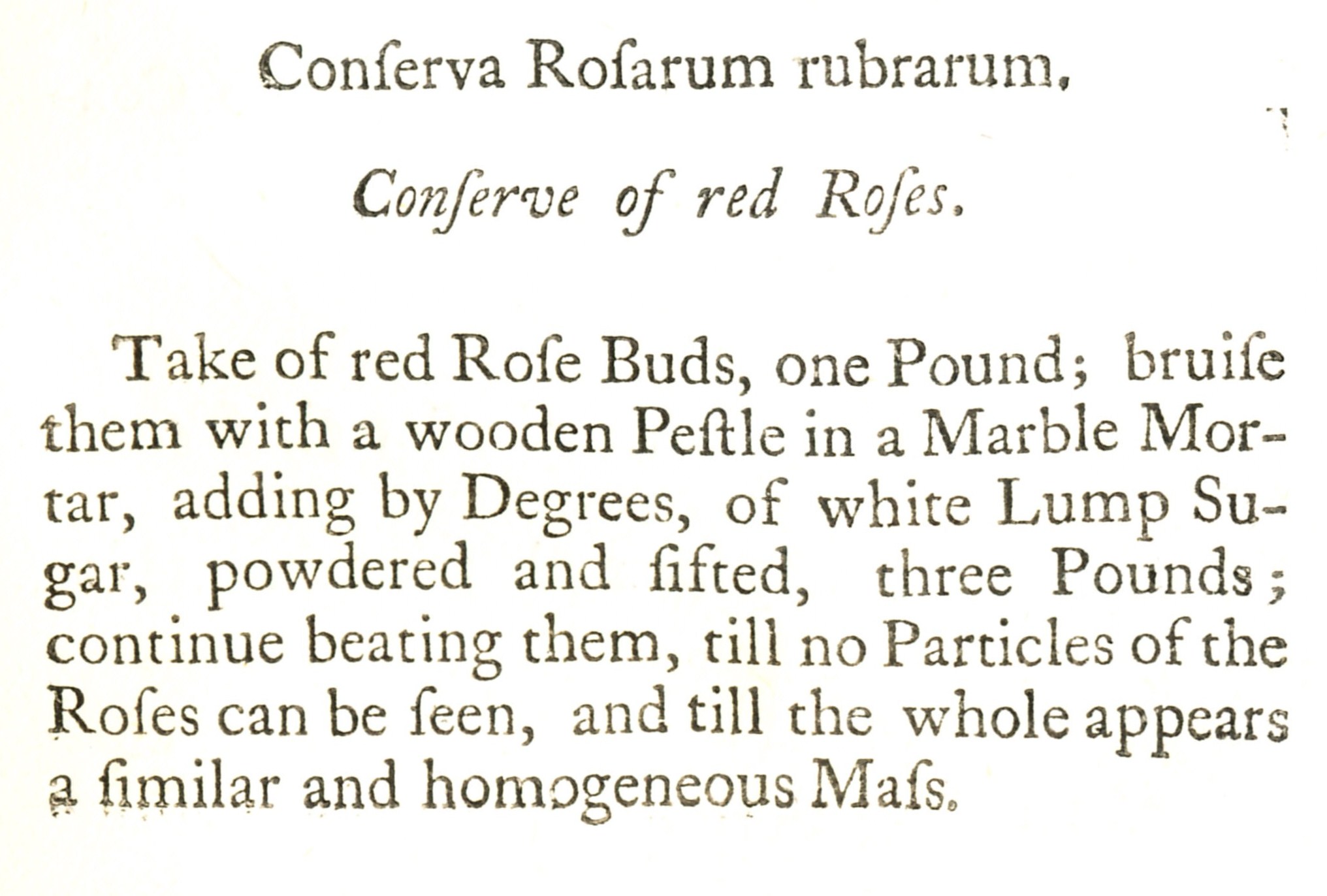 “Take of red Rose Buds, one Pound; bruise them with a wooden Pestle in a Marble Mortar,ading by degrees of white Lump Sugar, powdered and sifted, three Pounds; continue beating them, till no Particles of the Roses can be seen, and till the whole appears a similar and homogenous Mass.”