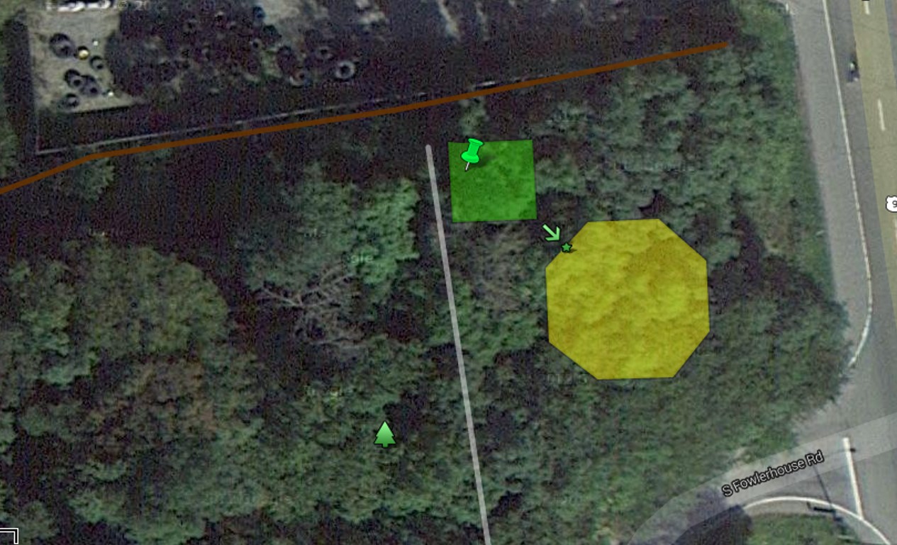 The green pin is the Rhubarb plant. The green dot on the edge of the Octagon is where the earth closet probably was. The center of that octagon had a layer of cement under the soil; this may be a few inches under the surface by now. The road through the woods is accessible via the Peggy Lane-North Fowlerhouse bend. It is cluttered with tree remains left by the neighbors and other yard greenery and debris. Follow the barely open path along the carriage road, and if necessary get up on the left stonewall and follow it up the hill.