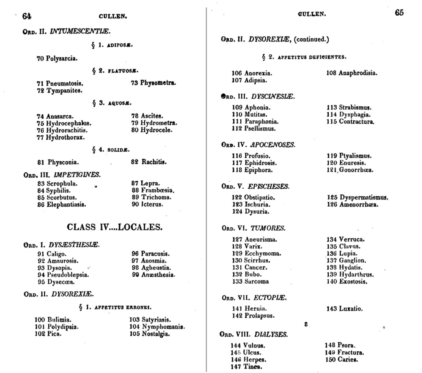 The following is Cullen’s complete nosology for 1785 (this version appears in David Hosack’s A System of Practical Nosology . . . 1825, for link see appendix.)