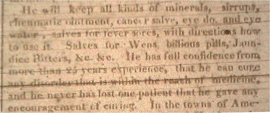 Unfortunately we don’t have any information on his materia medica, but based upon what his advertisement reveals we can still develop a picture of who he was as a healer.