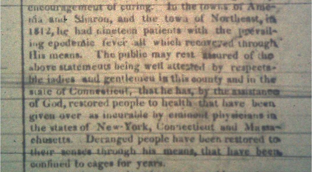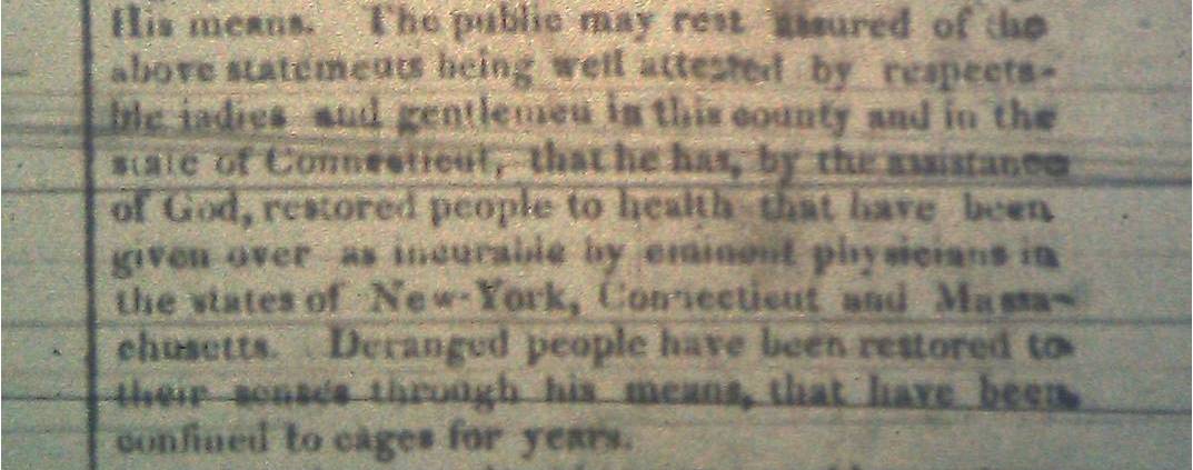 When I began reviewing the local newspaper of 1794 to 1810 once again, I wasn’t sure what I might find. I knew that I was looking at this important piece of local history from a new perspective. It had been 30 years since I sat down at a microfilm reader, in a much older library with a densely packed viewing room, and jotted down my first notes on the doctors advertising their services to the readers. It took me just a few minutes to make my first discovery of what I had overlooked these past 30 years, a doctor whose practice I could translate into modern-day terms–I knew that the use of “metalic” (sic) points referred to the use of metalic tractors. A short while later, I found the reference to a “healer” of sorts who was obviously well-known, but whose form of practice couldn’t be immediately identified. Still later in this review I came upon the “Botanist” Doctor. I wondered, ‘how could these important early “healers” in local history have been missed or ignored’? Then it occurred to me, the historians who noted these physicians were pretty much status quo and bore the philosophy of the medical majority for the time–they were anti-quackery thinkers and doers, the worst kind of medical historian still out there in this particular field of study.