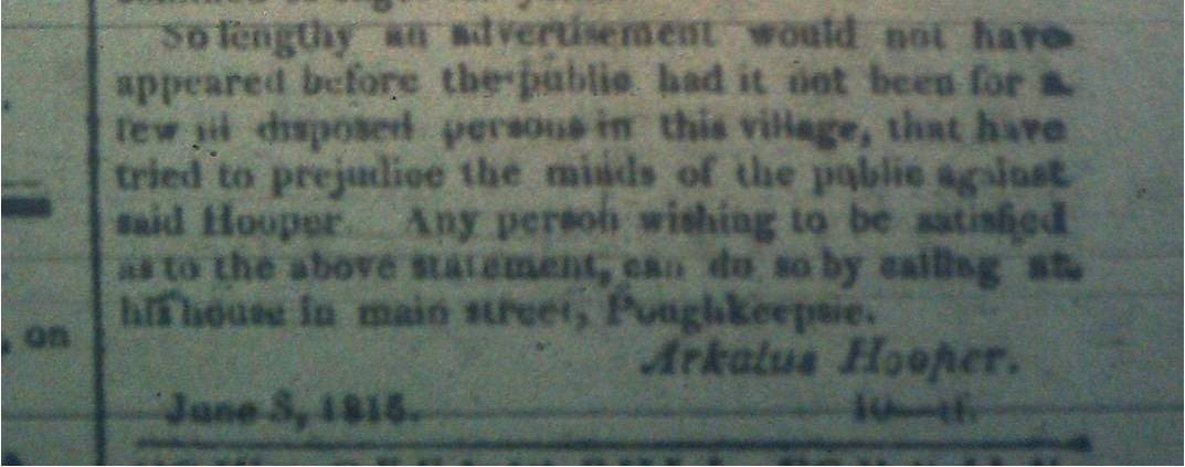 Fielding Garrison was culturally biased in his writings about medical history. Garrison failed to do much to learn about the alternative way of life or religiously based way of trying assist people, and so did not fully understand what it was that he was trying to avoid writing about. Famous historians like Garrison and all of his successors in past, recent, and modern medical history are pretty much guilty of this same methodology error as researchers–they were culturally biased researchers of a field in which doctors could have been considered practitioners of injustices many a time, stubborn competitors unable to allow for valuable changes such as the elimination of bleeding (one physician in Poughkeepsie tried to pass such a law for the state and failed). Regular medicine and its doctors were not completely bad, but bad enough to just be one small notch above those being labelled quacks. In Poughkeepsie, NY in 1816, Arkalus Hooper preached and passed on culturally significant knowledge his patent medicines. To the local native doctors he was a quack. Meanwhile, the primary leading physician for the time in Poughkeepsie, Dr. Van Kleeck, could do the same out of his drug store. Dr. Van Kleeck initiated the local medical society, and until this time did not have to refer to himself with the title “Dr.” Arkalus Hooper changed all of this. The town of Poughkeepsie was becoming more like a true city.