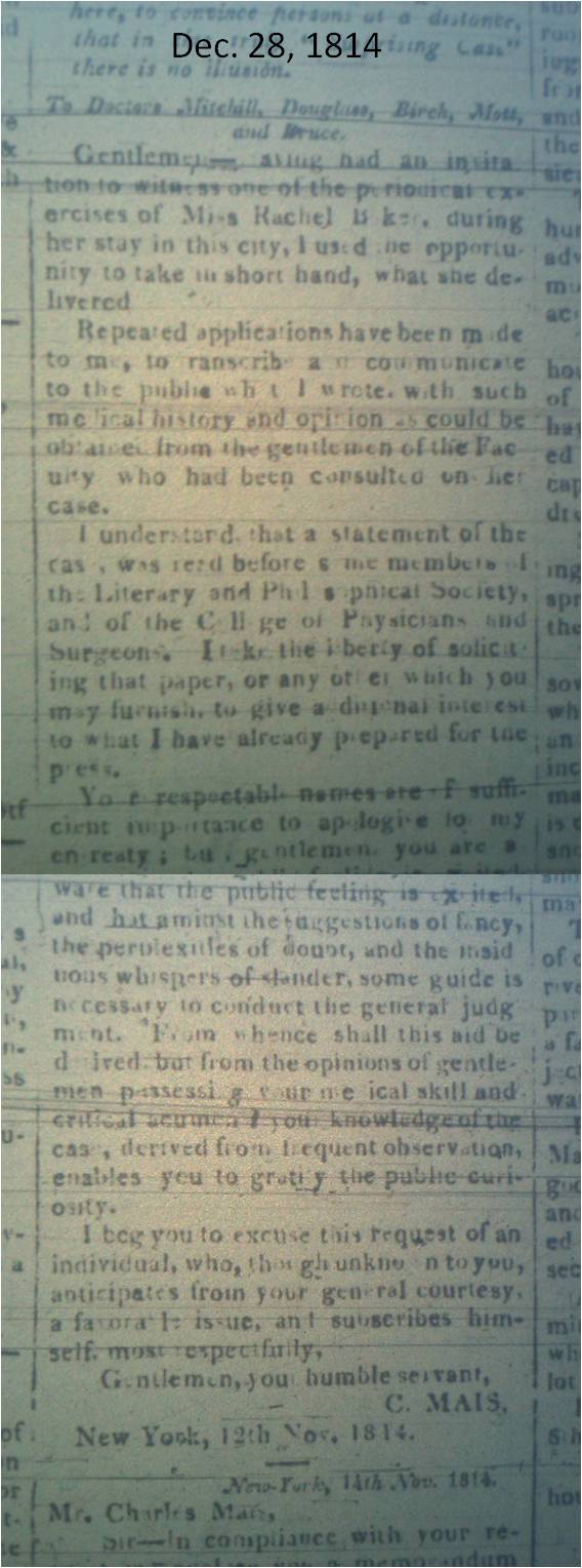 This takes us back to Dr. Samuel Mitchell’s discovery of a new diagnosis for an incredibly unique disease, perhaps the first of its kind for all time–Divine Somnambulism. The following article appeared in the Poughkeepsie Journal on December 28, 1814.