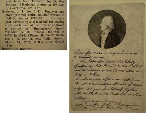 Saint-Mémin’s work and influences were also followed by those of J. J. Boudier. When Boudier brought this skill to the United States by way of Philadelphia, (yes, Philadelphia did every now and then actually introduce something before the people of the Hudson Valley), this artist’s skill remained one of a few creations that managed to retain its popularity in the urban settings located fairly close to the District of Columbia. (For more details on Boudier see http://www.rubylane.com/item/540480-MP-4787/c-1795-Profile-Portrait-J.) Boudier produced true size portraits for the most part, but on occasion made miniatures.
