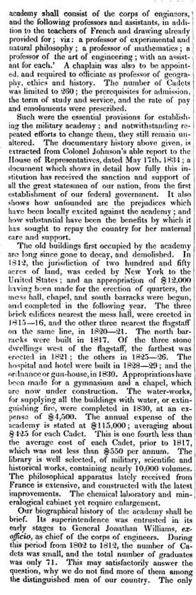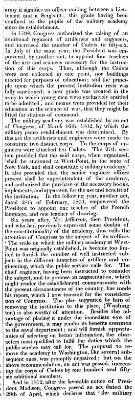 - 1802, March 16 — “Military Peace Establishment” defined with 10 cadets enrolled in the 27th Section stationed at West Point