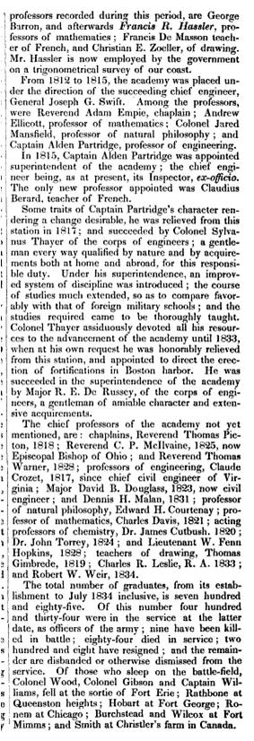 - 1812-1815 — Math, French and Drawing are major topics being taught. Math, Natural Philosophy and Engineering professors noted. A mathematics professor was busy surveying the local coastline. Captain Alden Partridge becomes Prof. of Engineering.