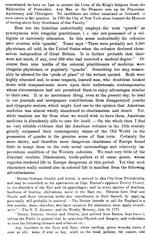 The final evidence showing these past writers haven’t dome much research on their original sources appears when they never consider and state the limited training that even the most elite of the regular doctors go through. Those without the proper schooling or apprenticeship history were considered “quacks,” meaning that many of today’s most important US physicians were also quack as wells. A very good argument against Smith and Yates statement appears in Outlines of the history of medicine and the medical profession (JH Vail & Co., NY, 1889). The authors of this work, Johann Hermann Baas and Henry Ebenezer Handerson, wrote the following commentary on Smith and Yates’s writings (pp. 823-5 sorry for the poor scans the IT tech/Student Employment department provided):