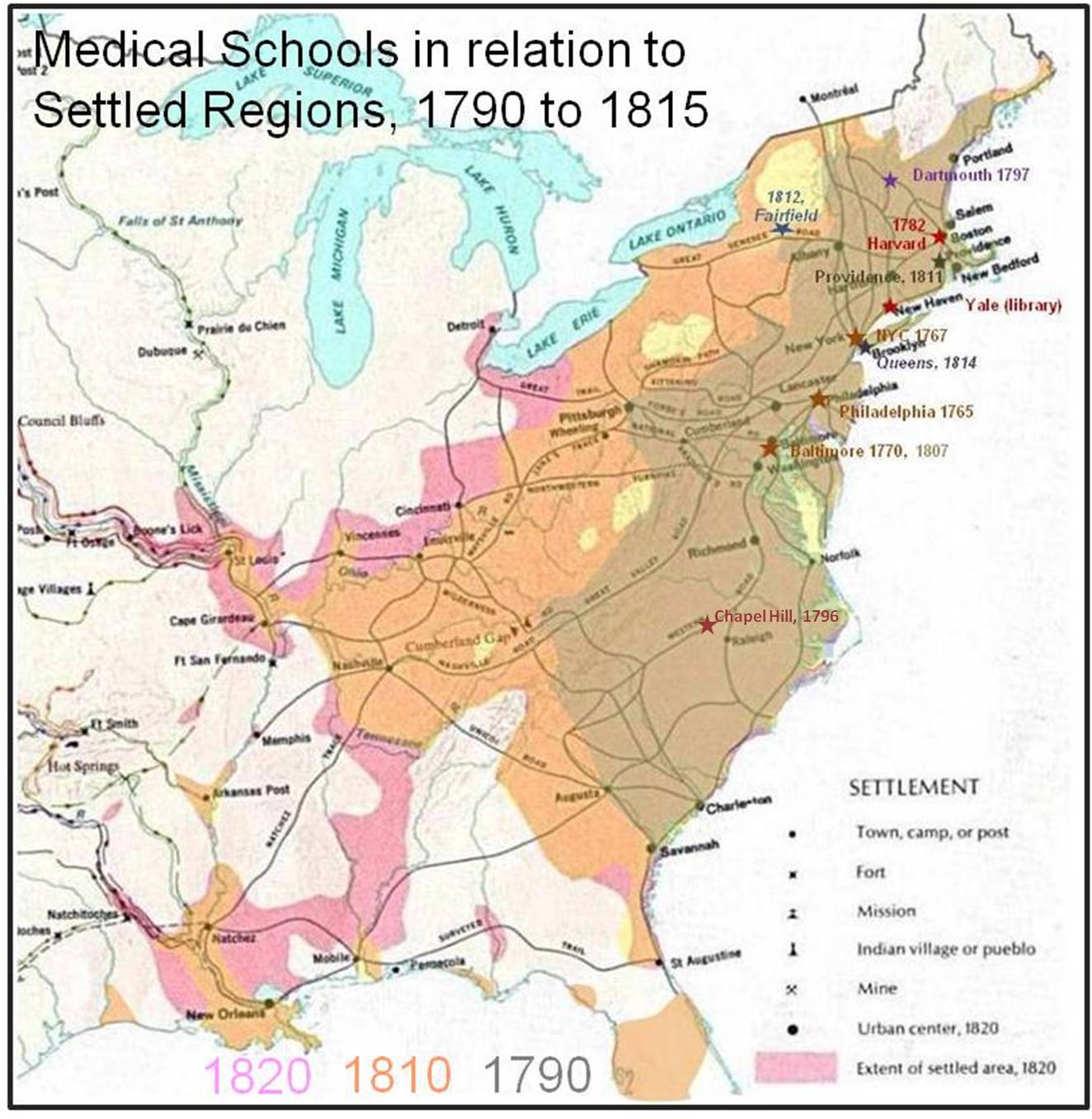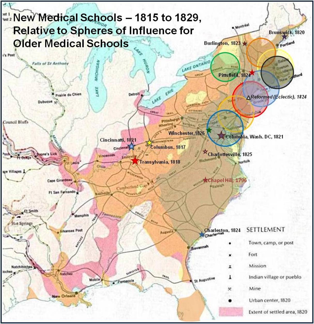 There is a tendency for schools to open in new places placed just outside to regions that are influenced. Some fill in the gaps between two well-spaced regions. The central group formed involving Transylvania, Columbus and Cincinnatti is a new site developed from which any cultural diffusion related to these schools is expected to continue in the years ahead. There is also the possibility that Charleston is going to be a place from where progress is made in generall economically and where new medical schools will later be required. We also see a ntendency for the schools to be aggregating around the mid-Atlantic to Boston region, an early sign of the megalopolis this region would later develop into.