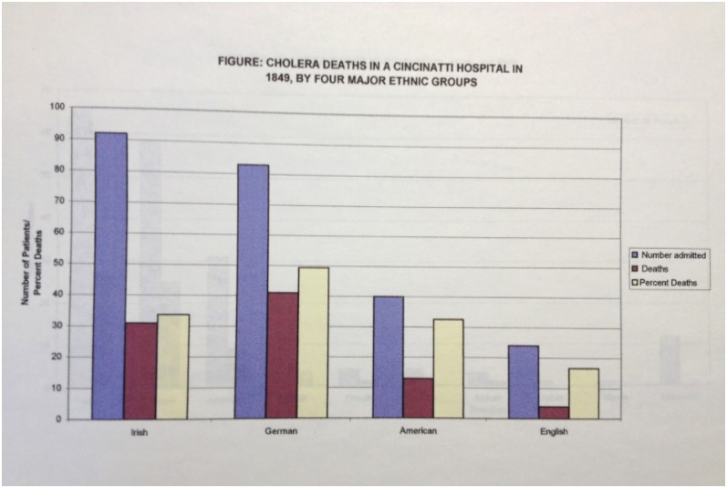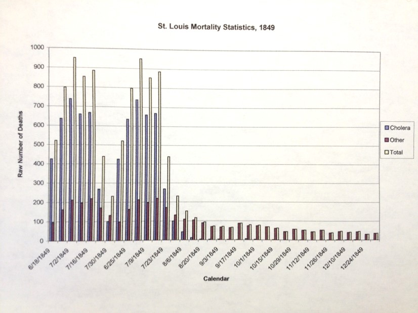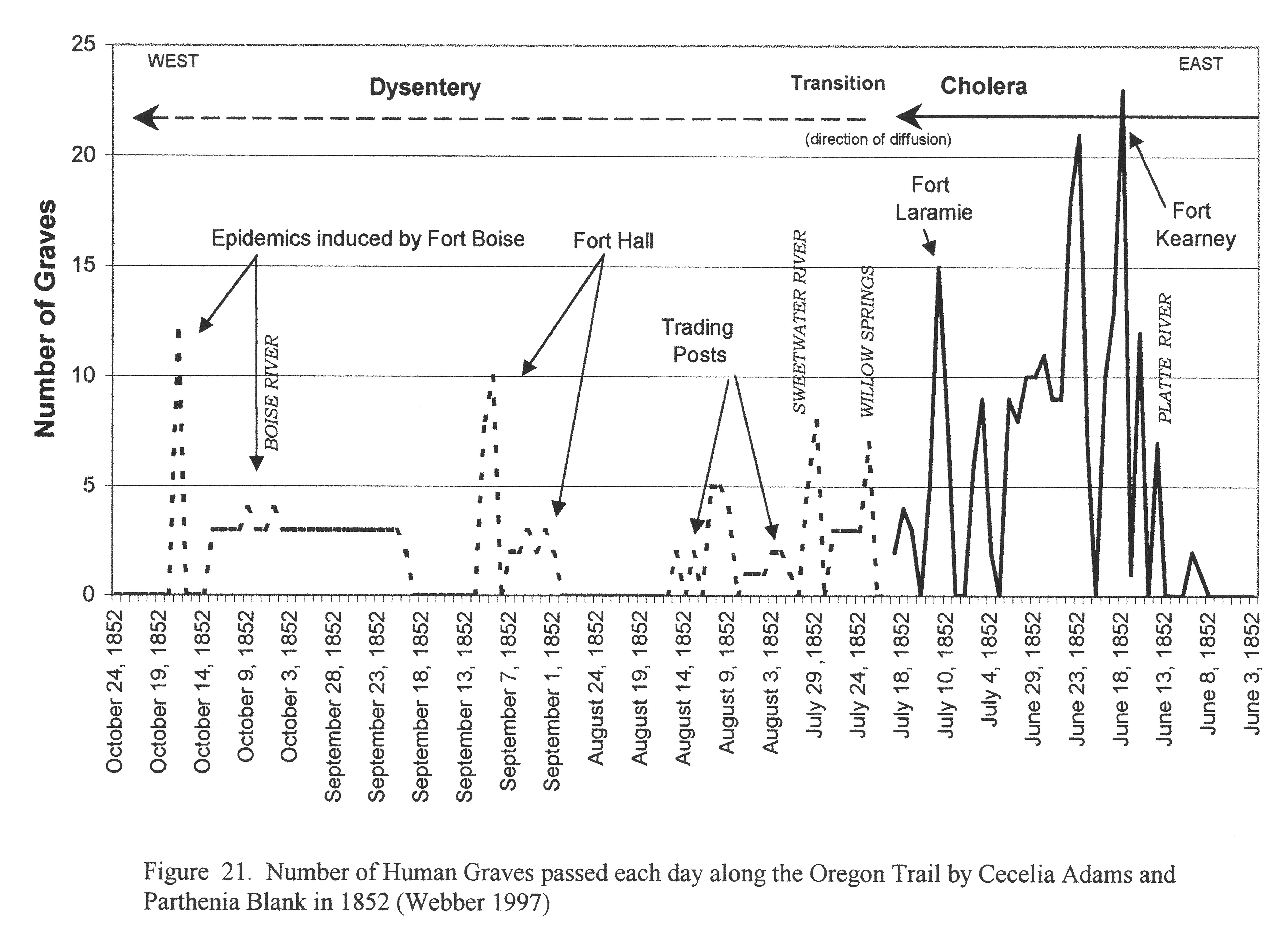 This dysentery form of “cholera” was replaced by the Asiatic cholera following the re-introduction of vibrio cholera through Louisiana via overseas ships docking there. Following the introduction of Asiatic cholera to Louisiana, it would make its way inland to the jump-off towns in western Missouri like St. Joseph. It was from these Jump-off sites that Asiatic cholera made its way onto the trail each summer from 1849 to 1853, so long as it was introduced to Louisiana or some other eastern urban setting close to St. Joseph from which it could spread. Since this disease requires warm climates to prevail, it usuallyu would not make its way onto the trail until the late spring weather began to take hold. The Oregon Trail became warm enough to support this epidemic only once the last snow and ice had melted. This characteristic made the distribution of Asiatic cholera and vibrio into the North American continent quite easy to predict. It was a consequence of the biological and ecological behavior that the bacterium responsible for Asiatic cholera had, which was fairly predictable once you understood this temperature-disease association, even without knowing it had a microbiological cause.