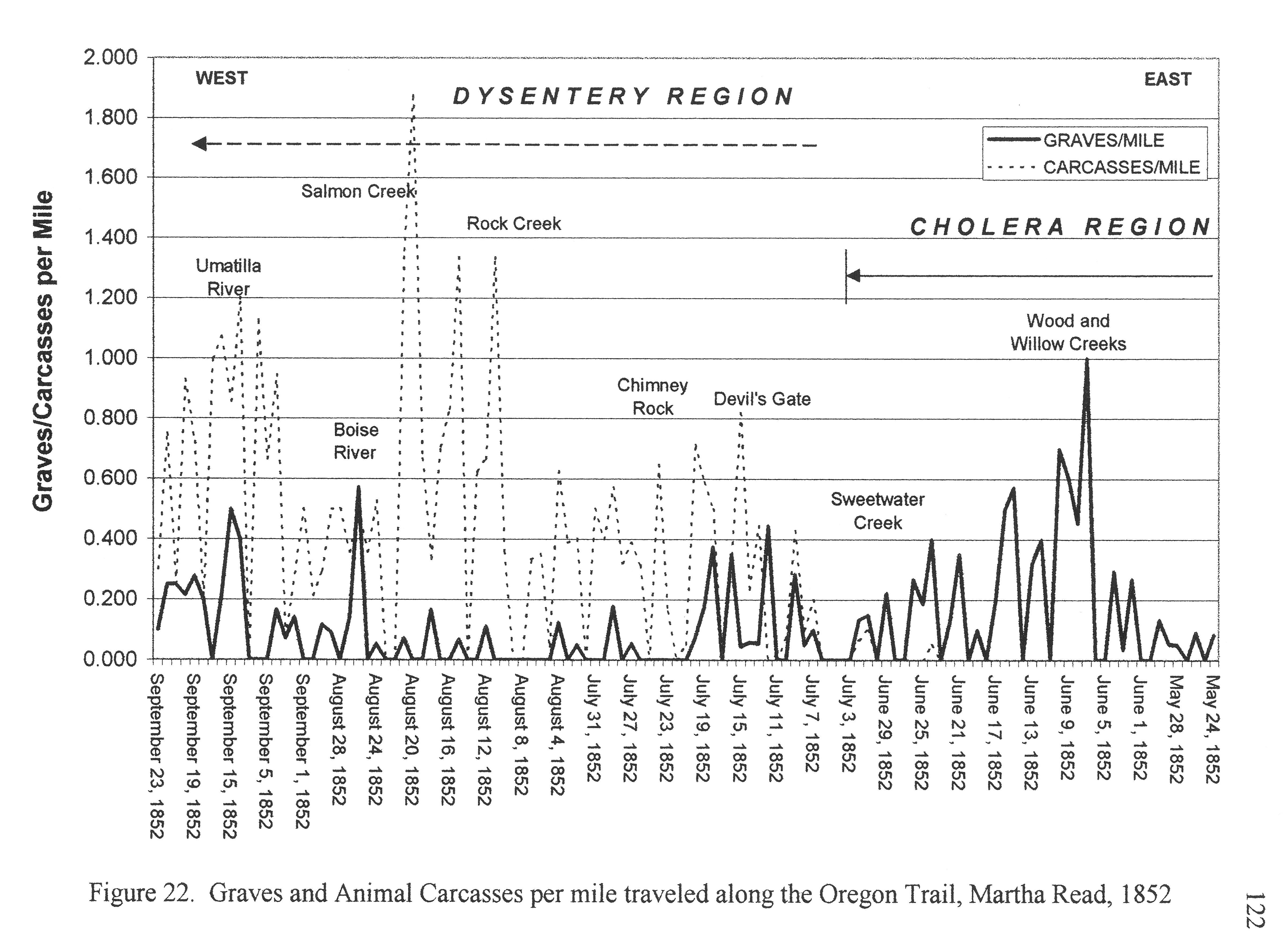 Later on along the trail, in Oregon, with the Asiatic cholera now subsided due to lack of adequate numbers of trail people and settlers to infect, the dysentery returned, this time due to the Salmonella intermedia common to animals, infecting people that passed by these animals through the previously defined water and vector-related disease diffusion processes. These cases were rarely fatal, however. These infections could easily result in dysentery that lasted as long as 40 days, and sometimes more or more. Unlike the commonly fatal Asiatic cholera, this dysentery rarely fatal and more discomfort many of the pioneers had to endure for weaks on end. The biggest years for this carcass-induced scourge of the Plains were 1852 and 1853, as many of the trail diaries tell us.
