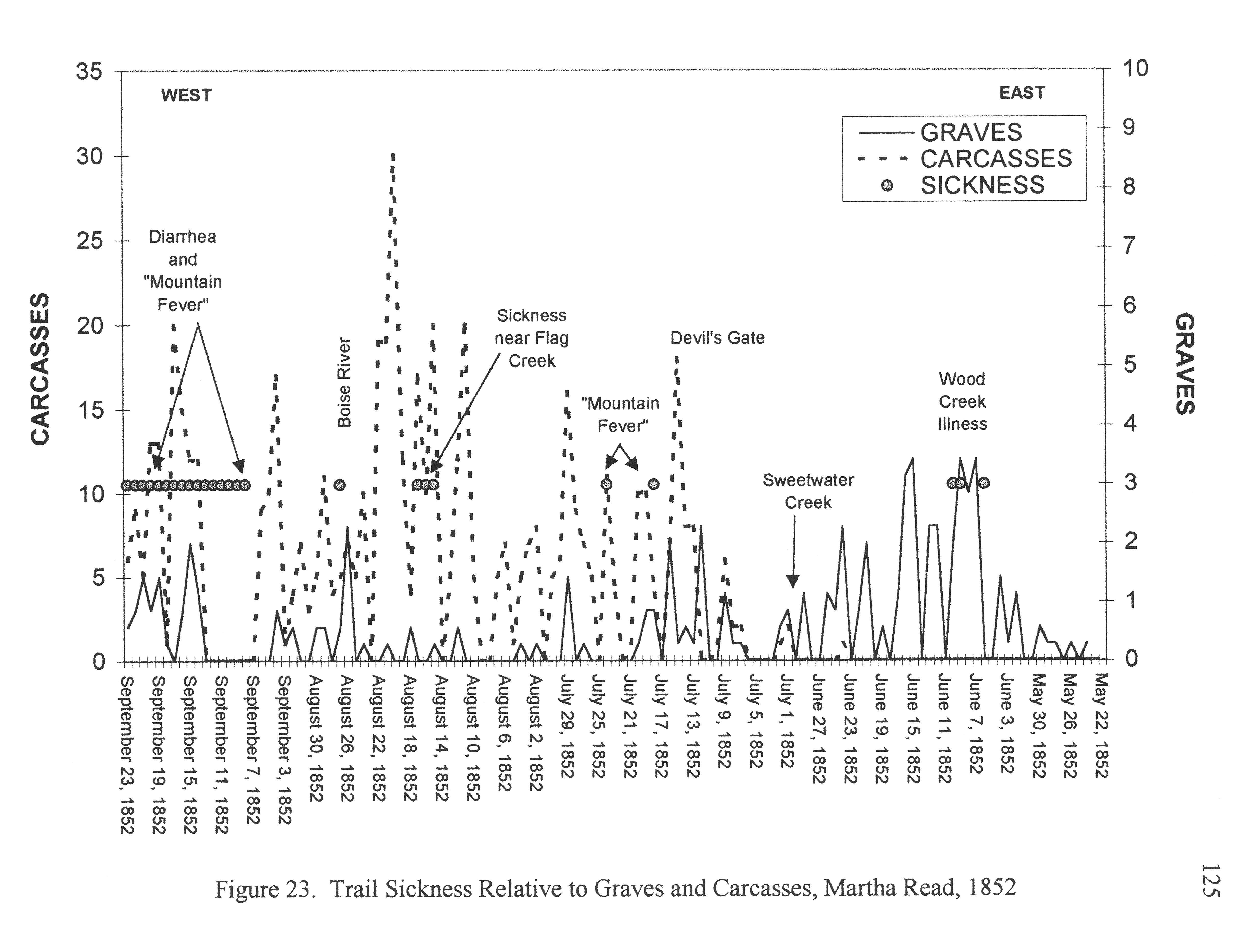 During this course of investigative epidemiological research I was also able to differentiate another disease often associated with the trail cholera from the dysentery cases–Mountain Fever, now known as Rocky Mountain Spotted Fever. Mountain Fever had its own ecological requirements for onset. Since it was due to tick-ridden areas bearing specific forms of plant and animal ecology, it occurred in the mountainous settings mostly in western Wyoming, and from there into Idaho. Again, the geography of the trail meant everything to understanding what kinds of diseases the overlanders were experiencing during their travels.