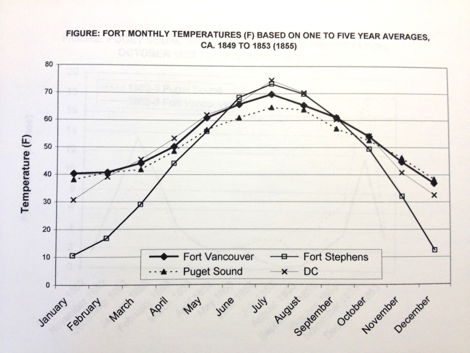 Fort Vancouver was most stable in terms of temperatures and therefore health. Fort Stephens offered the major max-min differences often recommended for treating consumption. DC is District of Columbia.