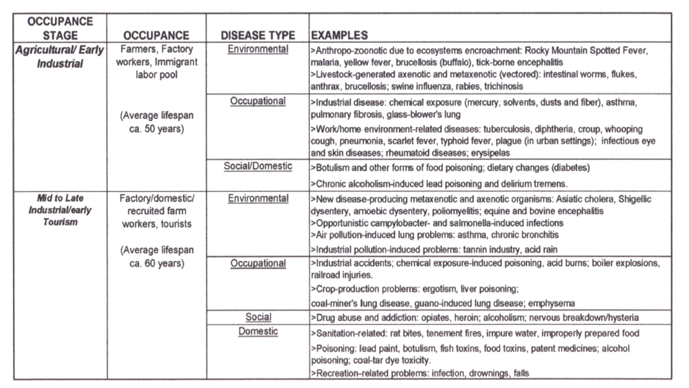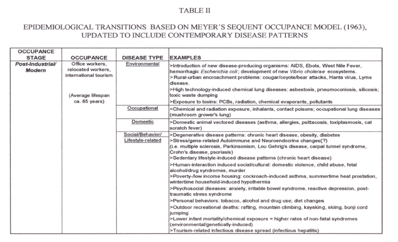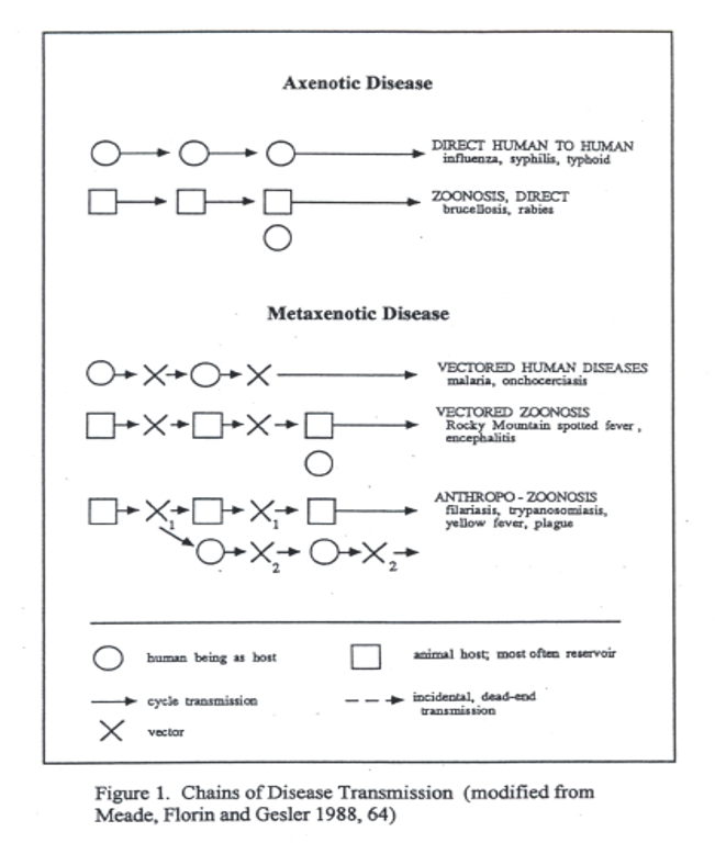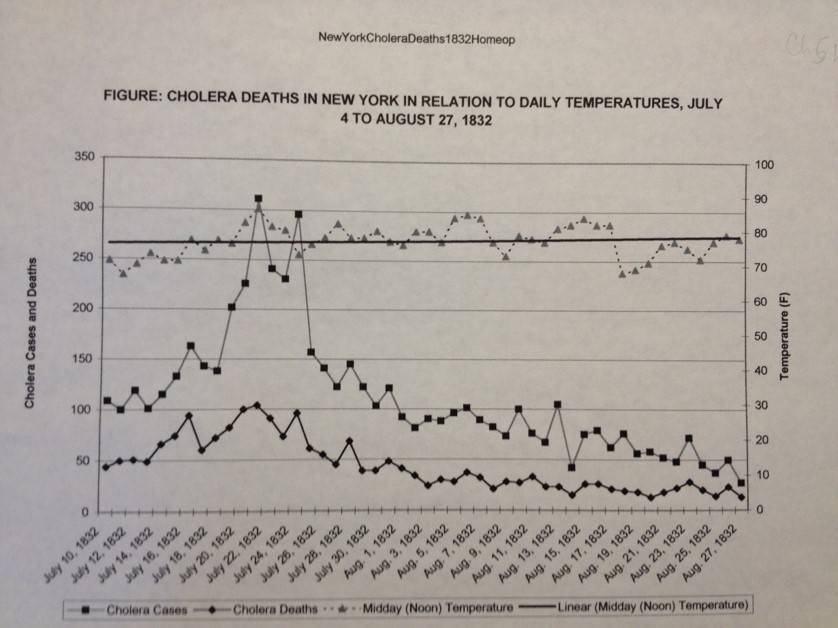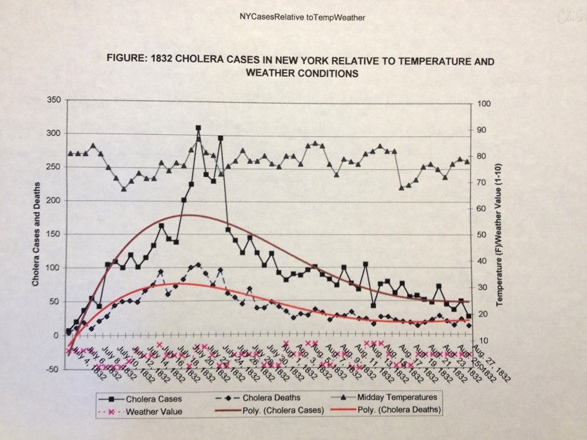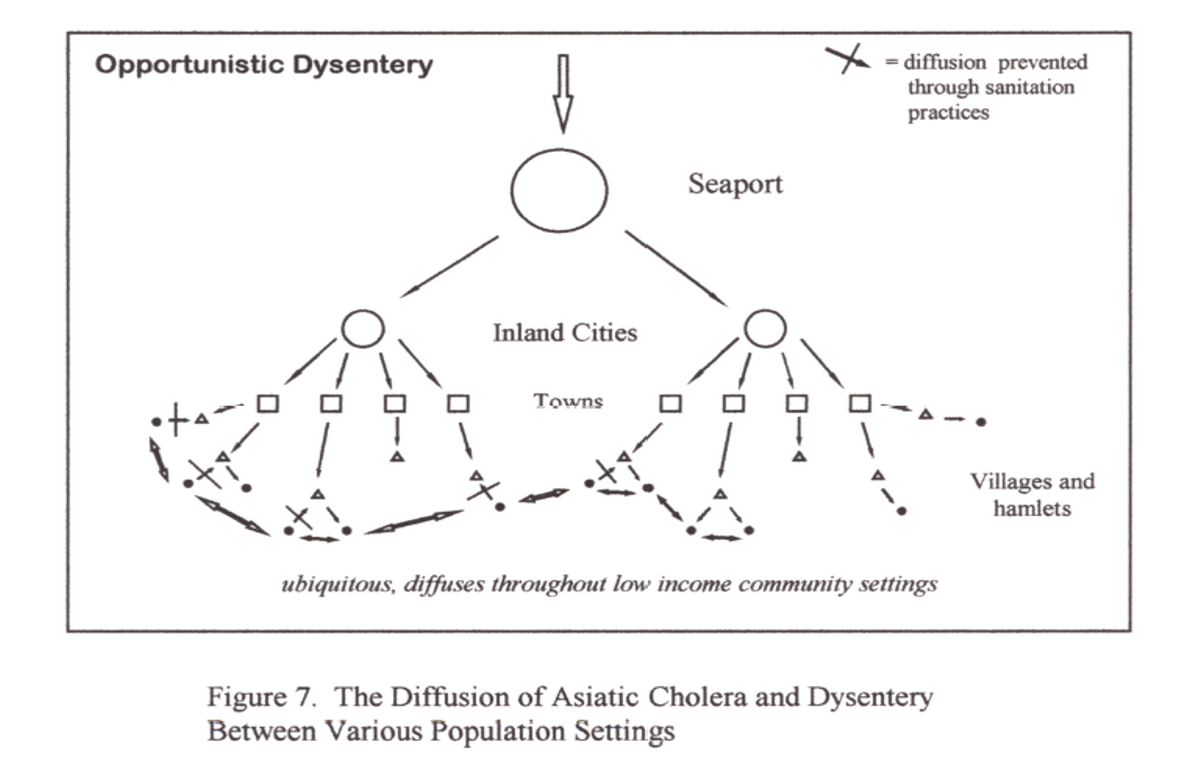 Climate sets the stage for this to happen in that the right temperature requirements have to be met in the organism’s natural setting–such as the water of a delta system, or more inland, a mineral spring with a fair amount of sun exposure and detritus in it. Thus climate and temperature make it possible for the vibrio to become reproductive, able to move about its ecological setting by infecting carriers of the bacterium, and ultimately make its way into the next person’s intestinal tract. In this way, the Asiatic cholera case diffusion process can be traced based upon temperature features, with potential hot spots for its natural evolution defined based upon soil pH and mineral/salt content, and potential epidemic regions defined based on local human population features. The ability for a newly erupted case to re-erupt is based upon features that enable the vibrio to survive between human victims, and come upon new potential candidates for the disease in a short enough time, while the vibrio sits in a natural medium supporting its growth and continuation of life.
