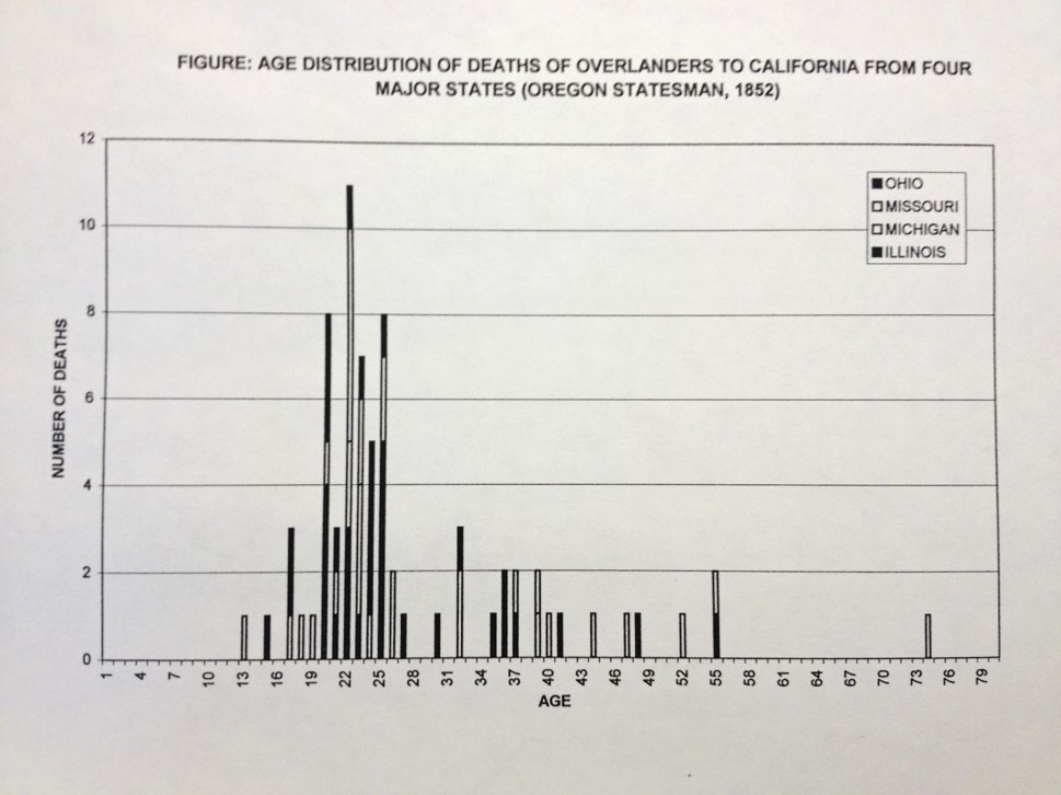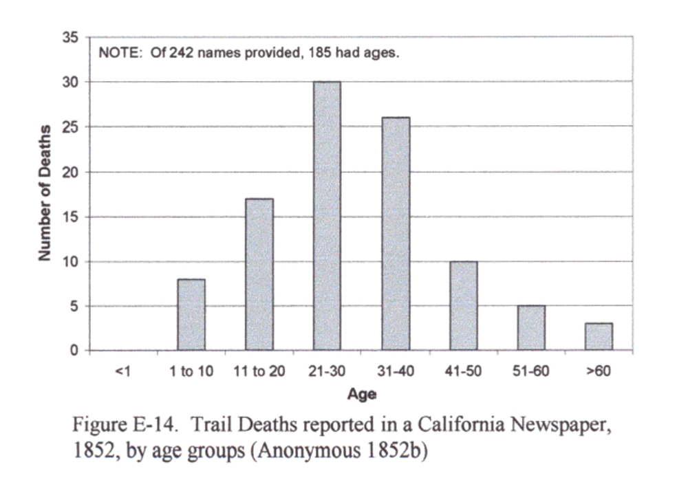 On the Trail, the young were very susceptible. Notice the peak in the 2-10 yo deaths along the trail (above figure), versus those trails deaths noted for people removing to California (below figure). This may be simply due to reporting, but could also be due to people’s behaviors with regard to reporting their children or their deaths, or the tendency for younger adults to engage in the migration for the pursuit of gold. The Oregon Trail research demonstrate that older adults and middle-aged adults were susceptible to Asiatic cholera just after Fort Kearney, due most likely to contamination that took place at and in the Fort itself or by use of its water. An aqueduct that travelled in a northeasterly direction connected the Fort to the River, adding more options for how the disease could be diffused. Diaries detail the many deaths that occurred in clusters within 1-3 days of leaving the Fort. Diaries also reveal a second series of deaths out west in Nebraska, just a few days before Fort Laramie. The common though is these deaths, many being children, were due to children simply becoming ill, often which cholera infantum. There were two plants (a Eupatorium sp. esp.) out there that poisoned the milk of cattle eating them, and subsequently any cattle milk fed babies.