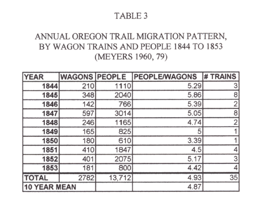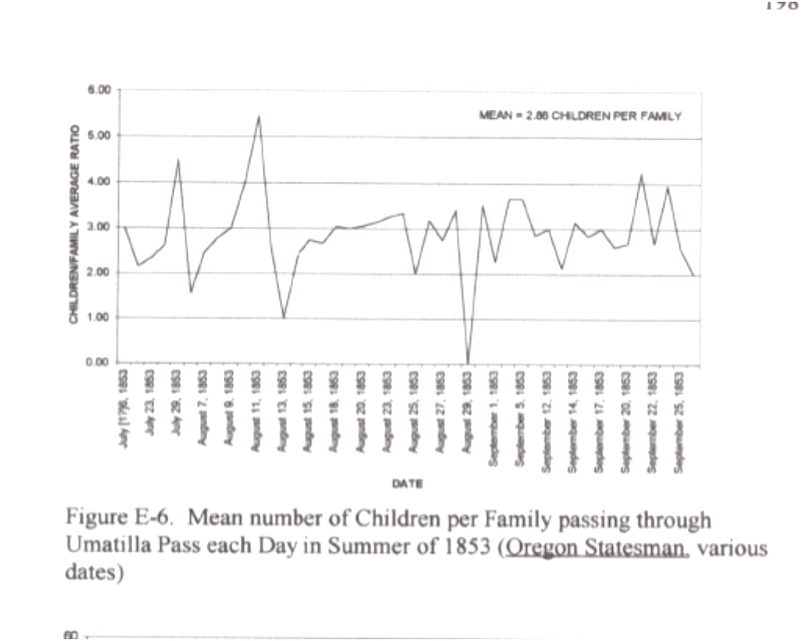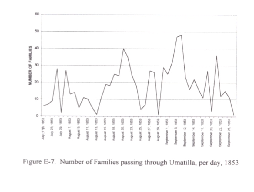 Notice the two large peaks coming through Umatilla Pass. When people departed, they departed as groups or clusters, which together formed chains once they were on the trail. This crowding increased susceptibility for disease spread and accidents, and later exposure to unsanitary living environments. We read a lot about families being isolated or in clusters of a few family and neighbor wagon groups, but there was also this tendency to travel together for purposes of survival, protection, and passing the time in the evenings. Culturally similar groups would have bound together more than ethnically or culturally dissimilar groups. Since disease prevention and behaviors are very much a product of cultural beliefs, this made it possible for a entire family or the bulk of some families to be wiped out. The Irish tended to be self-consoling with illness, the Germans according to my Cincinnati, Ohio and Warren County, Illinois studies (and related published articles) demonstrated a tendency to close the doors and windows whenever an epidemic erupted (fear of miasma spreading between wagons).