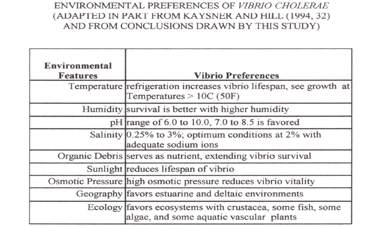 When we look at the distribution of cholera in other countries, we find it is a disease related to an organism native to the India-Bangladesh shorelines. The comma bacterium Vibrio cholera evolved within the natural setting of a deltaic environment. Its existence depends not only upon interactions with the various organisms in this area, but the interactions these organisms have with other parts of the food chain such as bottom feeders, shellfish, and consumers of these foods sources, like man.