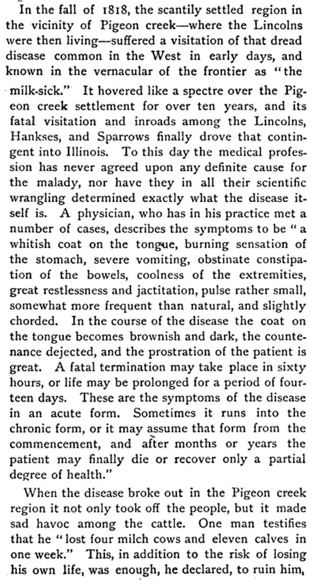 “In the fall of 1818, the scantily settled region in the vicinity of Pigeon Creek–where the Lincolns were then living–suffered a visitation of the dread disease common in the West in early sick days, and known in the vernacular of the frontier as the milksick! It hovered like a spectre over the Pigeon Creek settlement for over 10 years and its fatal visitations and inroads among the Lincolns, Hanks, and Sparrows finally drove that contingent into Illinois…It not only took off the people but it made safe havoc among the cattle. One man testifies that he lost four milk cows and 11 calves in one week. This in addition to risking his own life, was enough, he declared, to ruin him, and prompted him to leave for points further west!…Early in October of the year 1818, Thomas and Betsy Sparrow fell ill of the disease and died within a few days of each other….Meanwhile Abe’s mother had fallen a victim of the insidious disease. Her sufferings, however, were destined to be of brief duration. Within a week she, too, rested from her labors.”