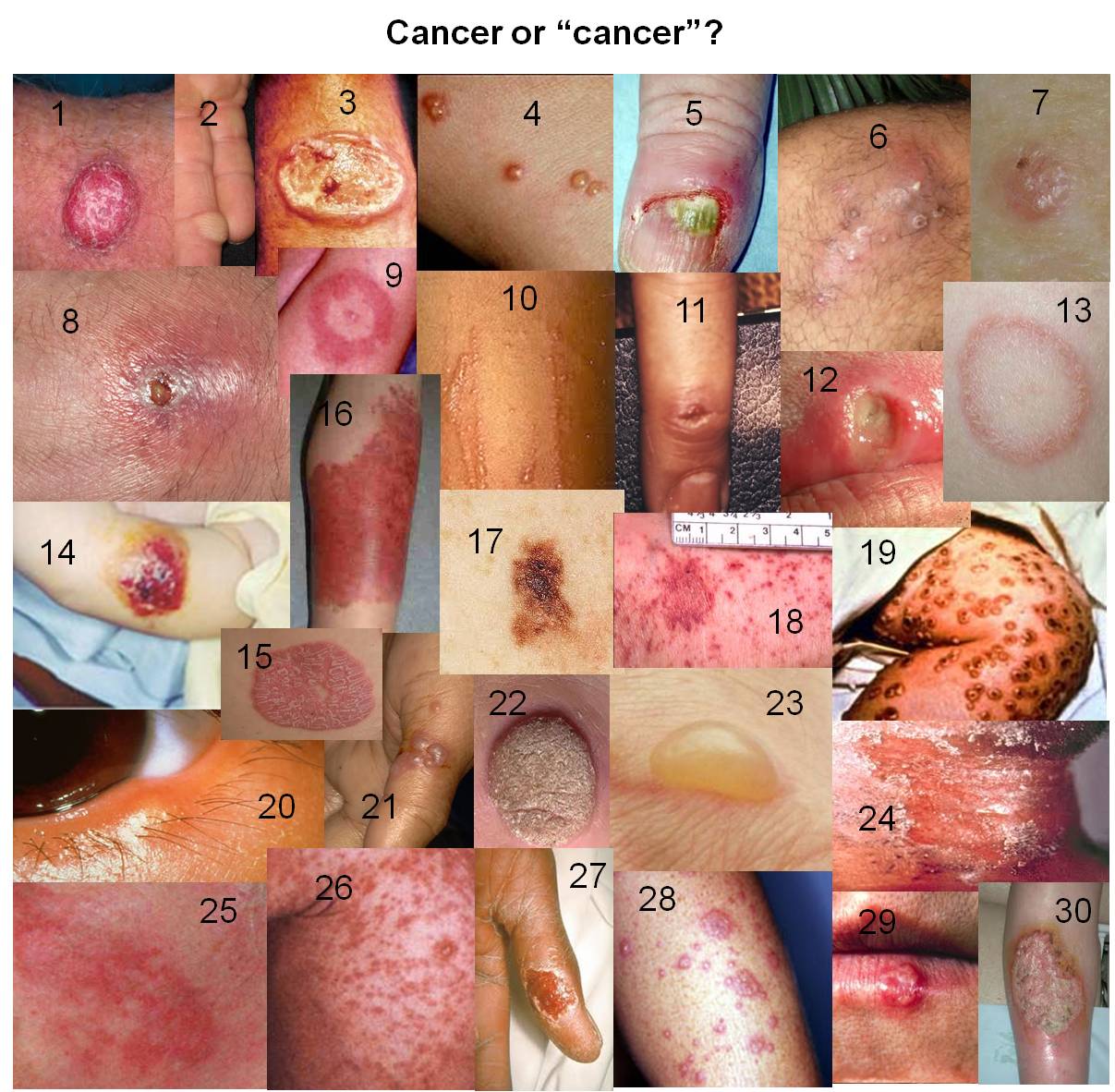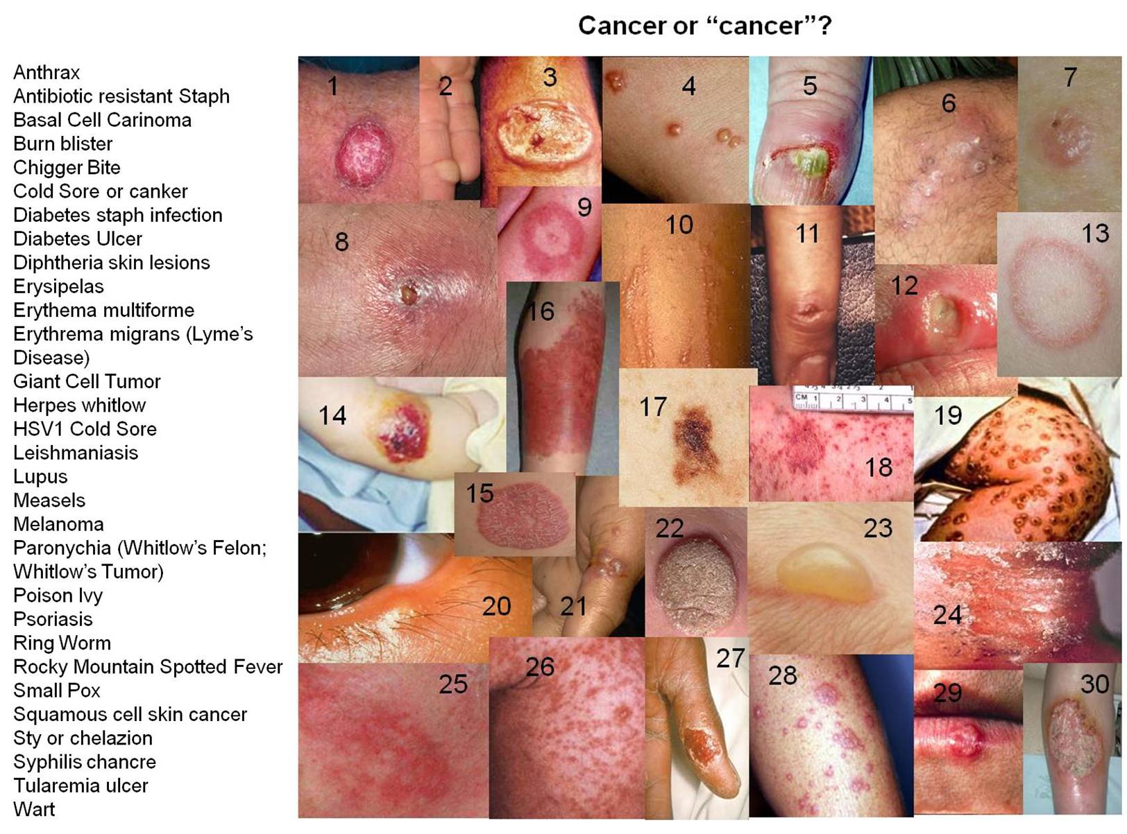That covers everything except for three things you’ll only see on occasion in passing. These cancers (the true ones) are nothing to worry about. They don’t behave as bad as the rashes, they only occasionally itch and bleed, they are not hot like erysipelas, they have nothing to do with things like measles and small pox, and usually have less symptoms and problem attached to them than most of the other conditions mentioned. These are problems to ignore, since they won’t get the best of you–at least you won’t ever see them cause that to happen. Or so a real doctor for this time might say.